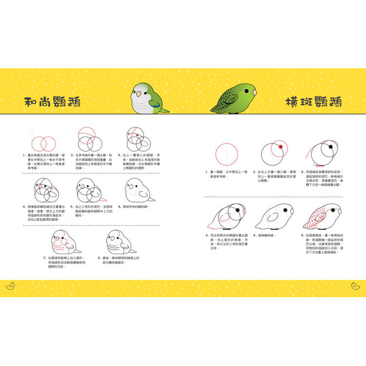 ◎步驟式圖解教學,搭配圓形等幾何結構提示,跟著範例就能輕鬆畫出渾圓生動的鳥寶!