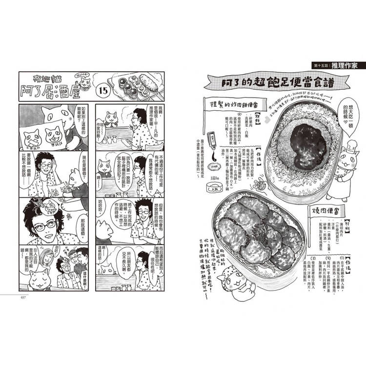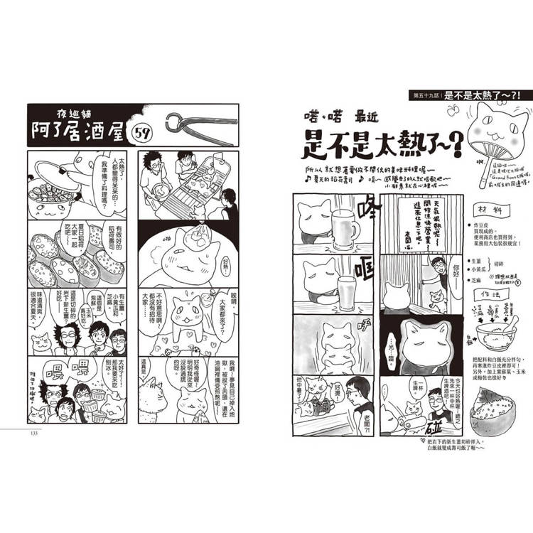 如果是此前從未讀過任何一本《夜巡貓》的讀者,由超人氣角色阿了擔綱主角的外傳作品,將會是你入坑的最佳選擇!八格漫畫篇篇獨立,閱讀門檻為零,除了本篇漫畫還有多則私房食譜、可愛插圖,內容保證豐富,是愛貓人士和料理愛好者都該擁有的一部佳作。而若是早已加入《夜巡貓》宇宙的舊友也不必擔心,本書不時會有讓人眼熟的老班底客串登場,包含本傳主角遠藤、大灰貓阿宙、抹布阿飛及魔犬兄弟,都將作為故事彩蛋出現在不同篇章裡,等待讀者自行探索!