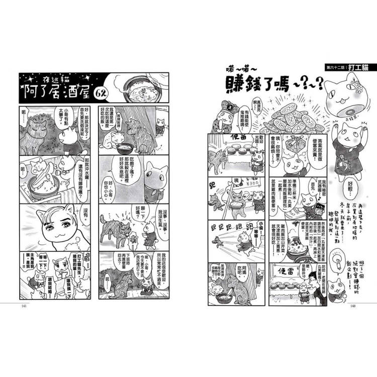於是深谷老師決定讓阿了開一間居酒屋!客人們聞香而來,眾人在這家小小的居酒屋裡,牽起更多的緣分、編織出有美食與彼此相伴的幸福時光。書中生動描繪阿了居酒屋的緣起、阿了和老奶奶阿幸的相處日常、以及阿了和牠的兄弟們「抹布阿飛」相遇的故事。溫柔中帶點笨拙、讓人無法不憐愛的阿了,這次也將以萬能的可愛征服眾讀者的心,絕對是《夜巡貓》的讀者乃至阿了的粉絲不容錯過的一部作品!
