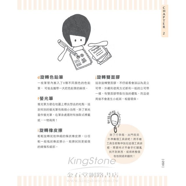 ◎作者從多年的手繪經驗中,對工具、筆記本紙張做出徹底的優缺點分析和建議,讓初學者省去摸索時間!