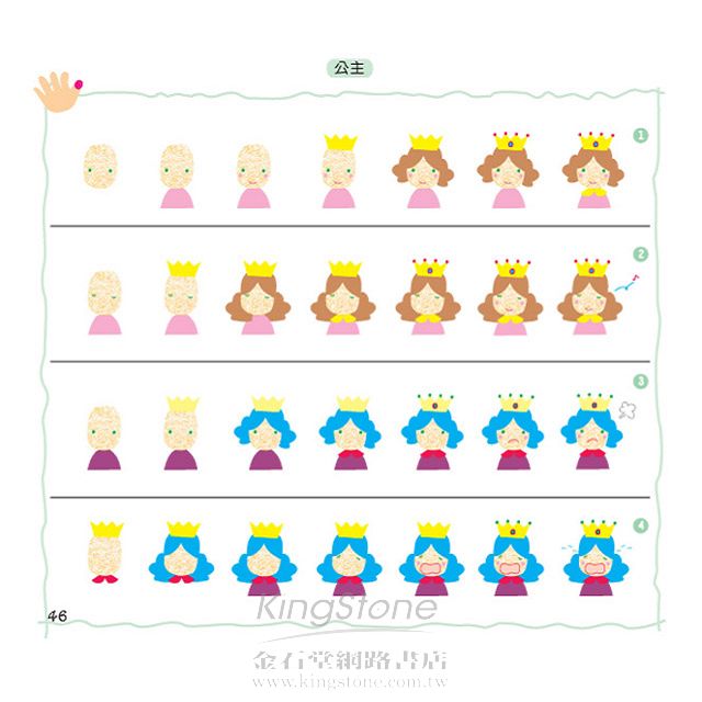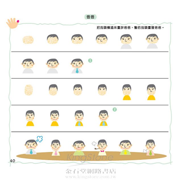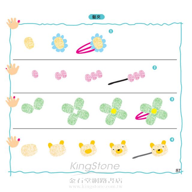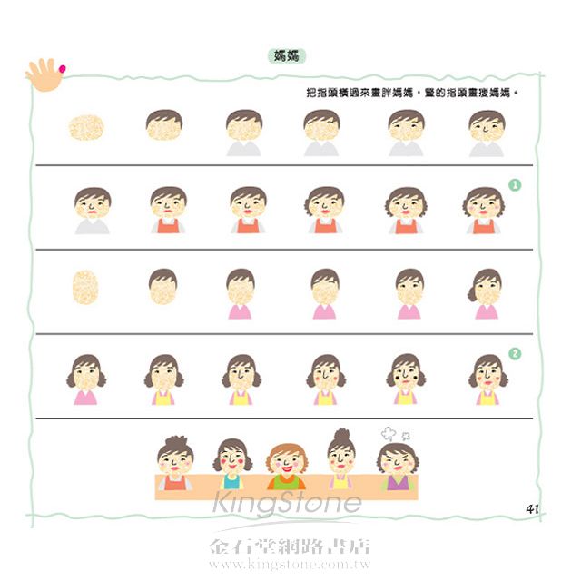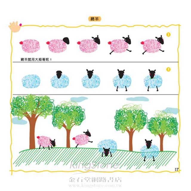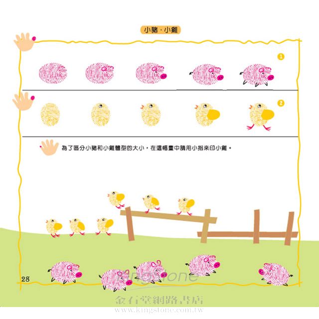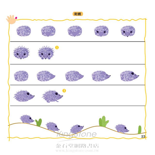 手印畫對小朋友來說是非常好的手指運動,可以靈活運用十根手指頭。書中共有96種造型示範,提供多元的想像空間,輕鬆開啟孩子的想像力與創造力。