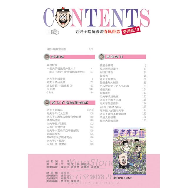 內容包羅萬象,由老夫子領軍各漫畫人物進行多項互動頁面的撰寫,豐富讀者的視覺與知識,相關主題包含