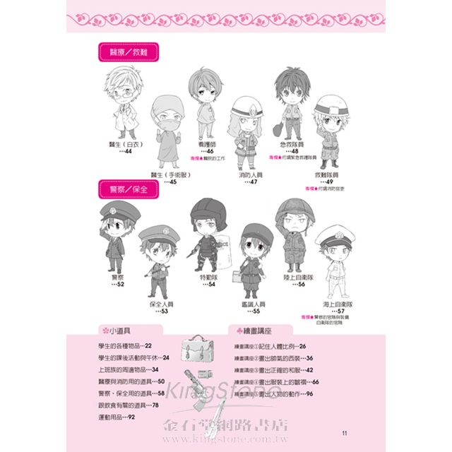 除了這些讓人心之神往的角色之外,本書收錄的制服款式相當多元,從白領到藍領,各行各業通通都有。在創作故事的時候非常實用,畢竟要畫一篇細節飽滿的寫實故事,故事中的角色可不能只有學長、醫生或是富二代。比如說:以工地作業員與調酒師為主角的深夜戲碼,或是打火兄弟之間的患難情誼,描述「特勤組」執行反恐機密任務似乎也很吸引人,畢竟是個可以同時展現體能、勇氣、智慧的全方位題材。