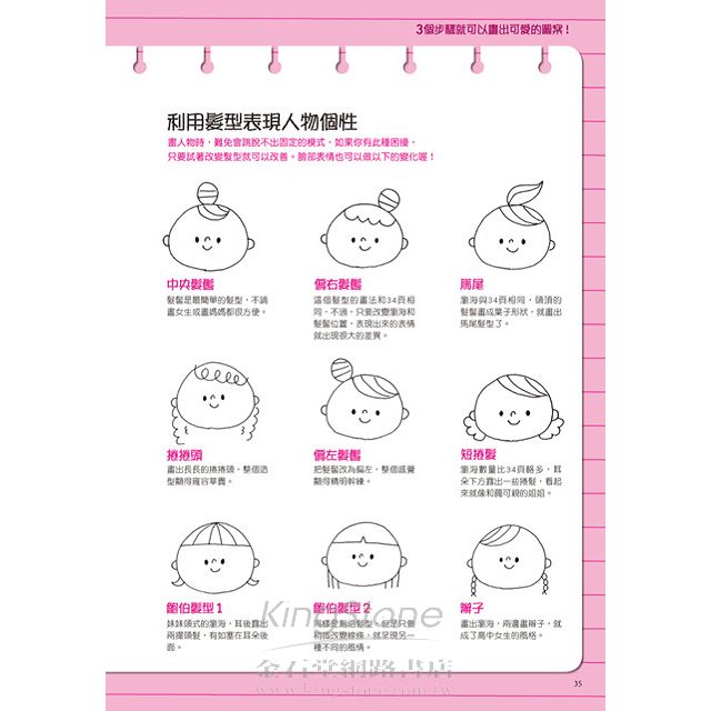 家裡的成員、生活周遭的小動物,就連蔬菜水果、交通工具都只要三個步驟就可以完成喔!首先畫出一個饅頭形的圓形,兩邊加2個小小的耳朵接下來在饅頭中央畫小小的眼、鼻、口最後在額頭正中央畫兩根香蕉做為瀏海,上面再畫一個兩條橫紋的髮髻,就完成包包頭的髮型。
