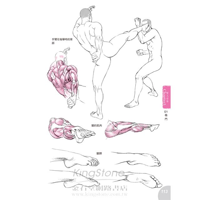 介紹各種姿勢,從行走坐臥到跑跳格鬥,皆以透視肌肉圖解說。