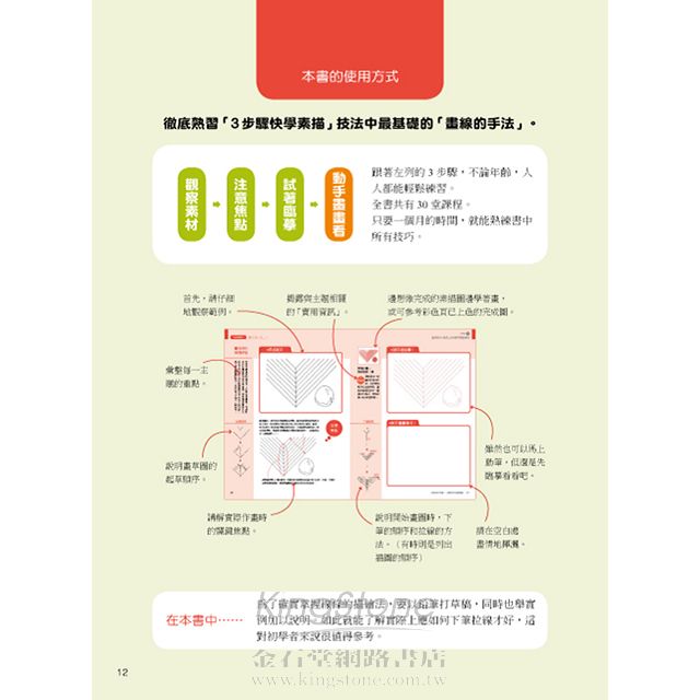 STEP1 觀察素材 → STEP2 注意焦點 → STEP3 試著臨摹