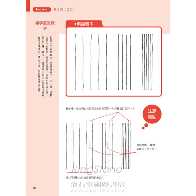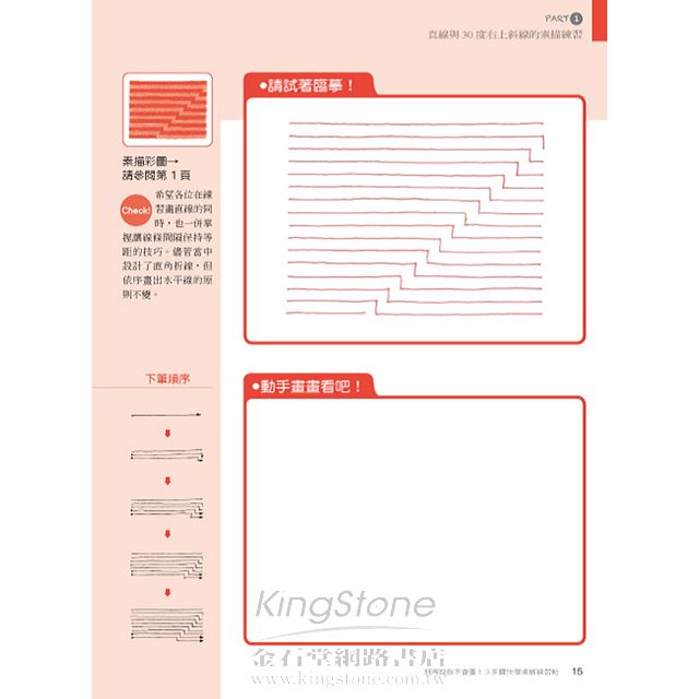 本書共設計了30堂課程,是便於各位在30日內集中練習的素描練習帖。只要花一個月的時間,就能讓您確實掌握「3步驟快學素描」所需的基本線條繪法。在此列舉出本書的三大特點:
