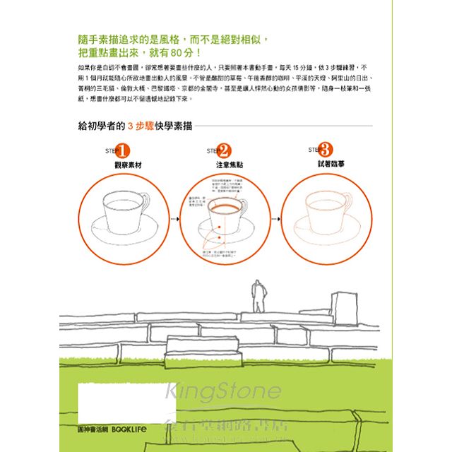 如果你是自認不會畫圖,卻常想著要畫些什麼的人,只要照著本書動手畫,每天15分鐘,依3步驟練習,不用1個月就能隨心所欲地畫出動人的風景。不管是酸甜的草莓、午後香醇的咖啡、平溪的天燈、阿里山的日出、菁桐的三毛貓、倫敦大橋、巴黎鐵塔、京都的金閣寺,甚至是讓人怦然心動的女孩倩影等,隨身一枝筆和一張紙,想畫什麼都可以不留遺憾地記錄下來。