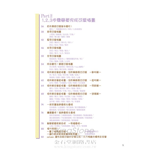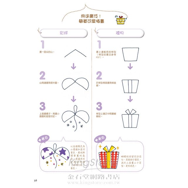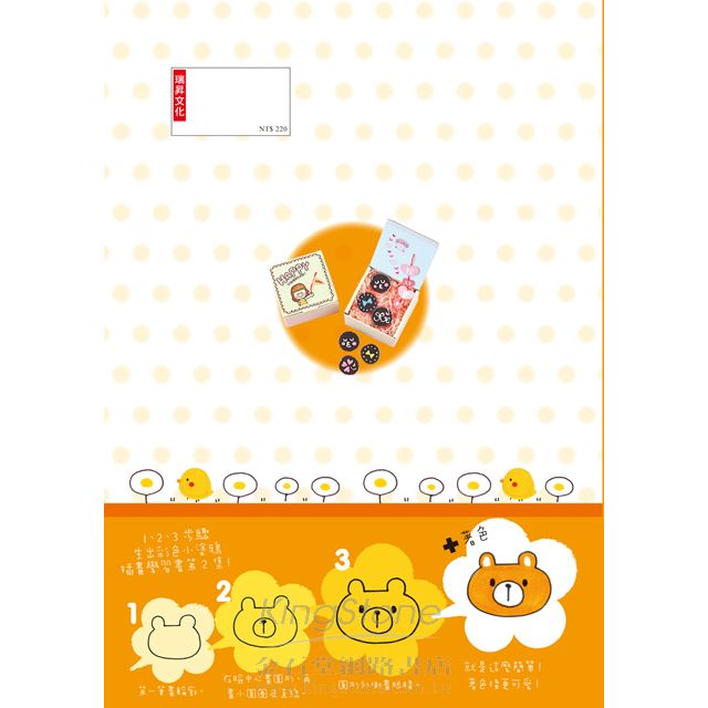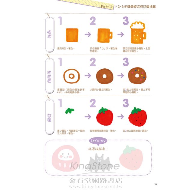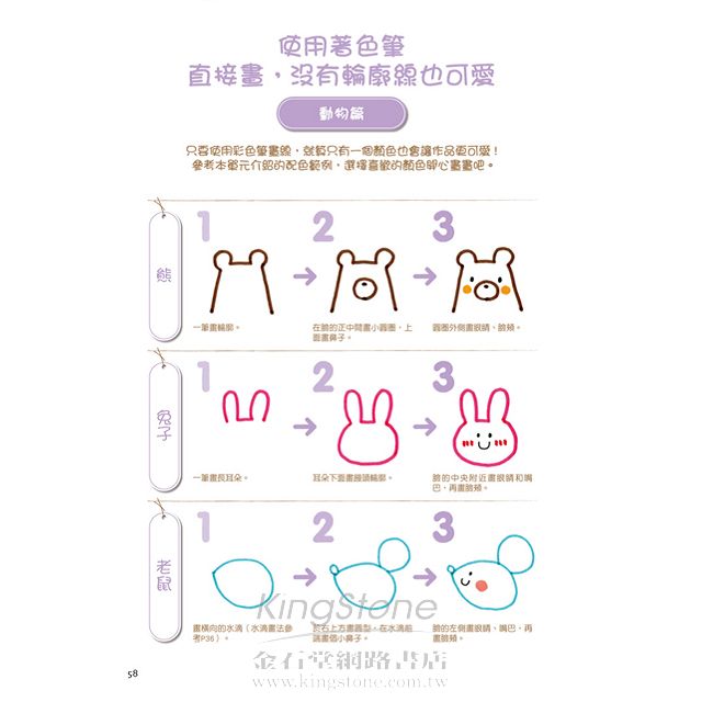 每款可愛插畫作品當然都只要1、2、3的簡單三步驟就能完成。不會畫畫的人也OK!附錄著色完畢的插畫作品,一筆一劃跟著畫,絕對會成功!