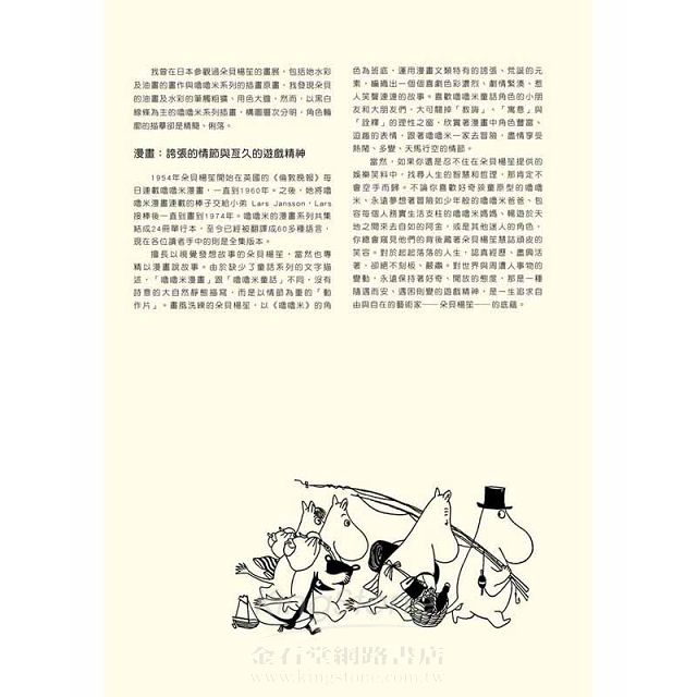 當然,如果你還是忍不住在朵貝楊笙提供的娛樂笑料中,找尋人生的智慧和哲理,那肯定不會空手而歸。不論你喜歡好奇孩童原型的嚕嚕米、永遠夢想著冒險如少年般的嚕嚕米爸爸、包容每個人務實生活支柱的嚕嚕米媽媽、暢遊於天地之間來去自如的阿金,或是其他迷人的角色,你總會窺見他們的背後藏著朵貝楊笙慧詰頑皮的笑容。對於起起落落的人生,認真經歷、盡興活著,卻絕不刻板、嚴肅。對世界與周遭人事物的變動,永遠保持著好奇、開放的態度,那是一種隨遇而安、遇困則變的遊戲精神,是一生追求自由與自在的藝術家──朵貝楊笙──的底藴。