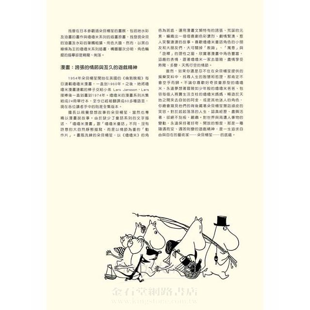 當然,如果你還是忍不住在朵貝楊笙提供的娛樂笑料中,找尋人生的智慧和哲理,那肯定不會空手而歸。不論你喜歡好奇孩童原型的嚕嚕米、永遠夢想著冒險如少年般的嚕嚕米爸爸、包容每個人務實生活支柱的嚕嚕米媽媽、暢遊於天地之間來去自如的阿金,或是其他迷人的角色,你總會窺見他們的背後藏著朵貝楊笙慧詰頑皮的笑容。對於起起落落的人生,認真經歷、盡興活著,卻絕不刻板、嚴肅。對世界與周遭人事物的變動,永遠保持著好奇、開放的態度,那是一種隨遇而安、遇困則變的遊戲精神,是一生追求自由與自在的藝術家──朵貝楊笙──的底藴。
