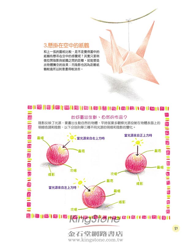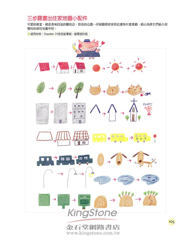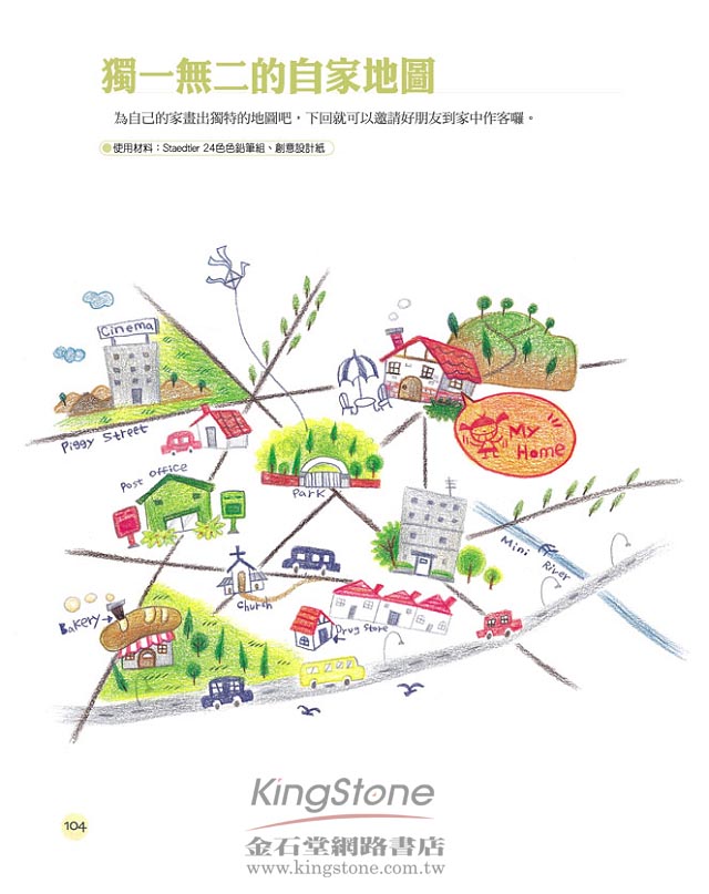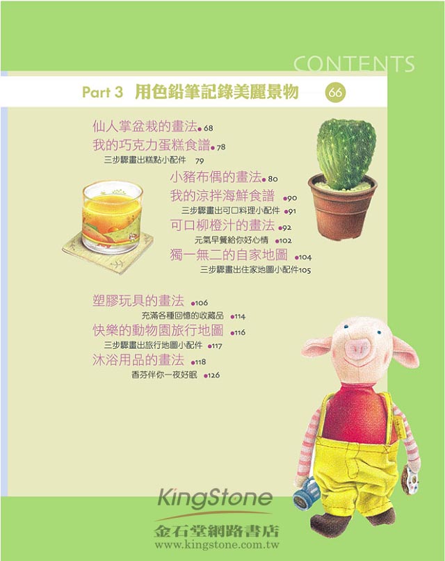 本書還介紹浪漫黃昏、新鮮欲滴的蘋果、美味可口的果汁、可愛的玩具、生活小物……等的畫法,透過詳盡的步驟示範及具體明白的說明,一步一步輕鬆完成畫作。此外,更教你三步驟自製專屬食譜、獨一無二的自家地圖、快樂的旅行地圖……。現在,就帶著色鉛筆,隨時記錄生活周遭的點點滴滴。
