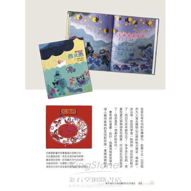 這番效法陶侃搬磚的沉甸甸,卻是個很享受的過程。寫就本書的這段時間,翻閱這些圖畫書,成為我私密時光的甜美珍釀。每天浸淫在波茲卡大咧咧的艷紅、帕萊切克的夢話、杜桑凱利的詭譎、荒井良二的塗鴉、張世明的古老傳說…,一顆在夢幻世界中穿來穿去的心,連雙眼都被綺麗色彩與書香燻得迷濛起來。每週二下午再帶著七彩泡泡的心情去上老師一堂課,直到被老師響亮的笑聲給敲醒(或說被他的聲量給嚇醒)。