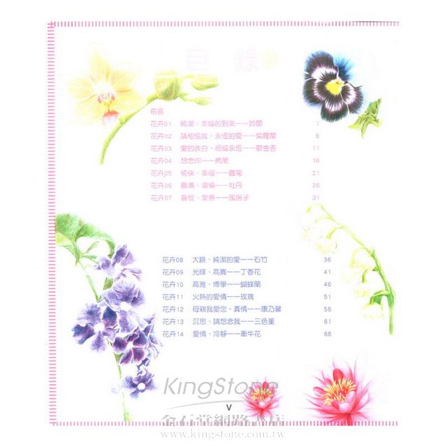 本書介紹了各式各樣花卉繪畫方法,特過花的局部繪製,講解了用色鉛筆繪製花卉所需的方法,之後從勾勒花朵的線稿、逐漸上色到整體調整,最後一幅完整的作品就展現在你的眼前了。