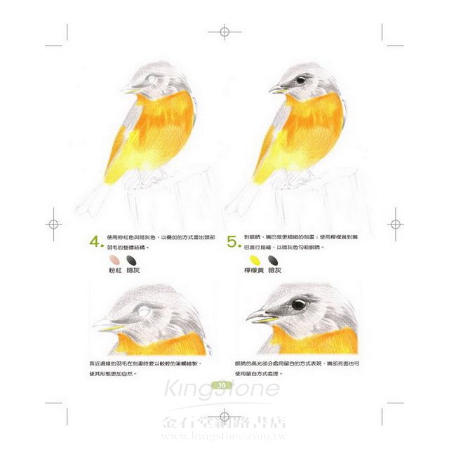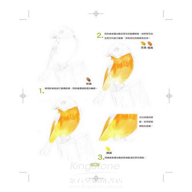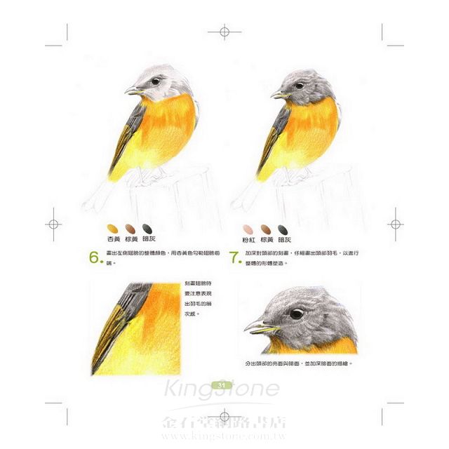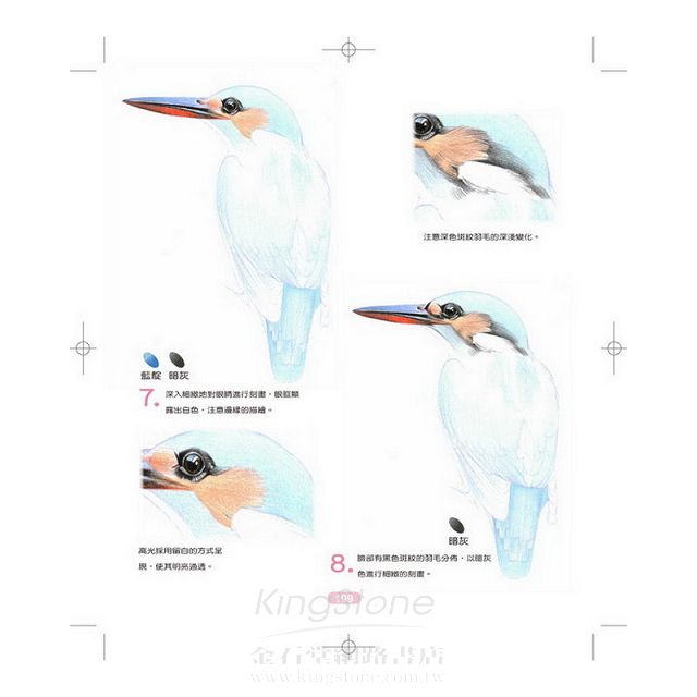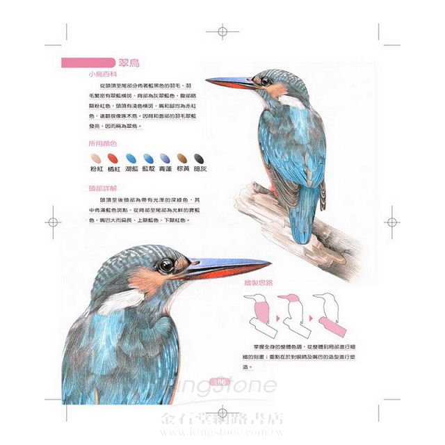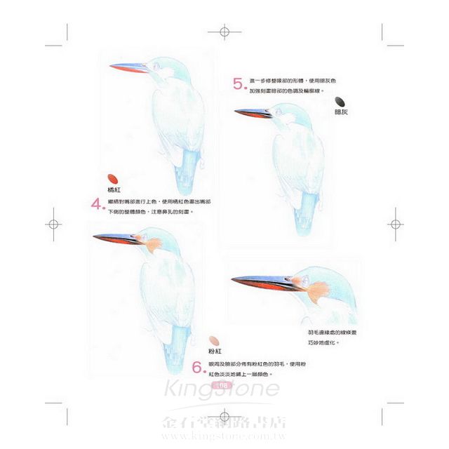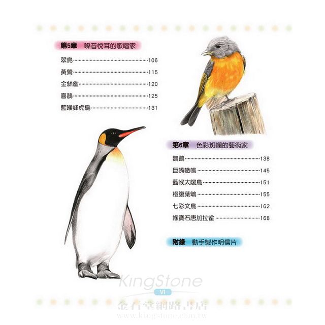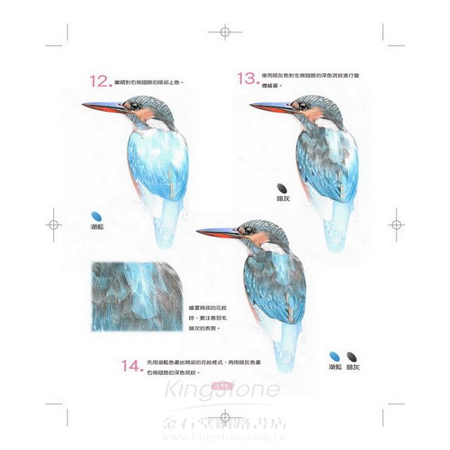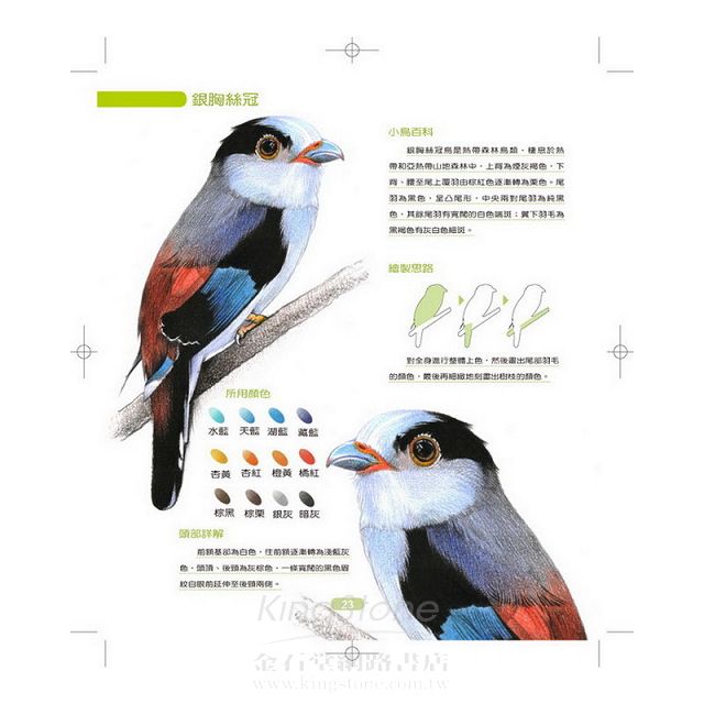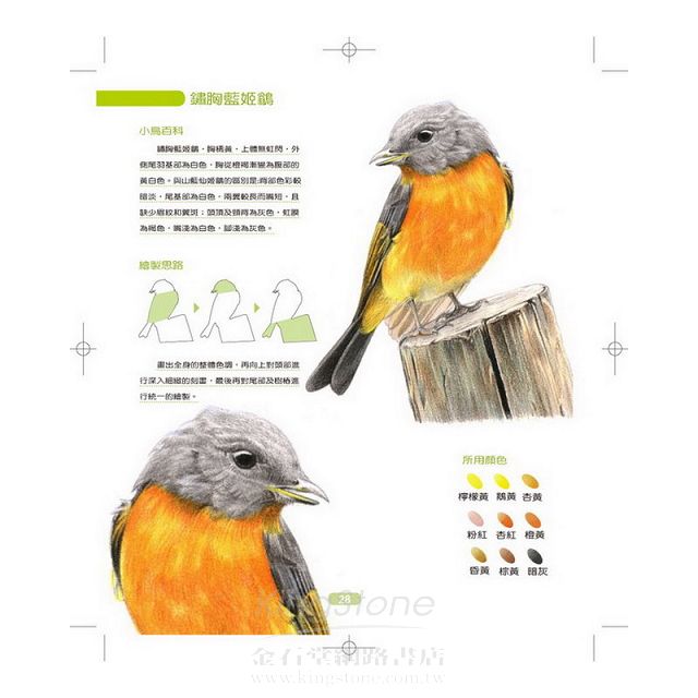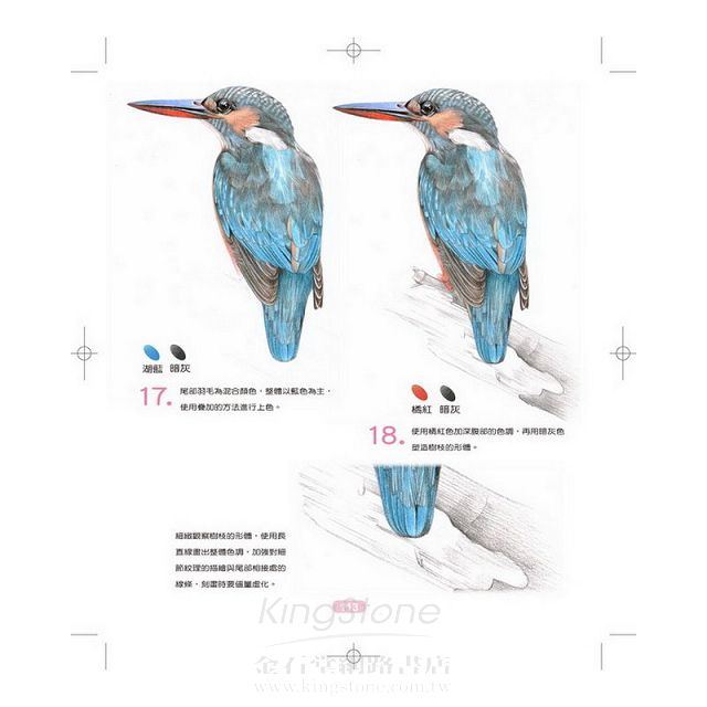 本書藉由26幅繪畫作品的逐步示範,使讀者透徹瞭解不同場景及各種鳥類的詳細畫法。
