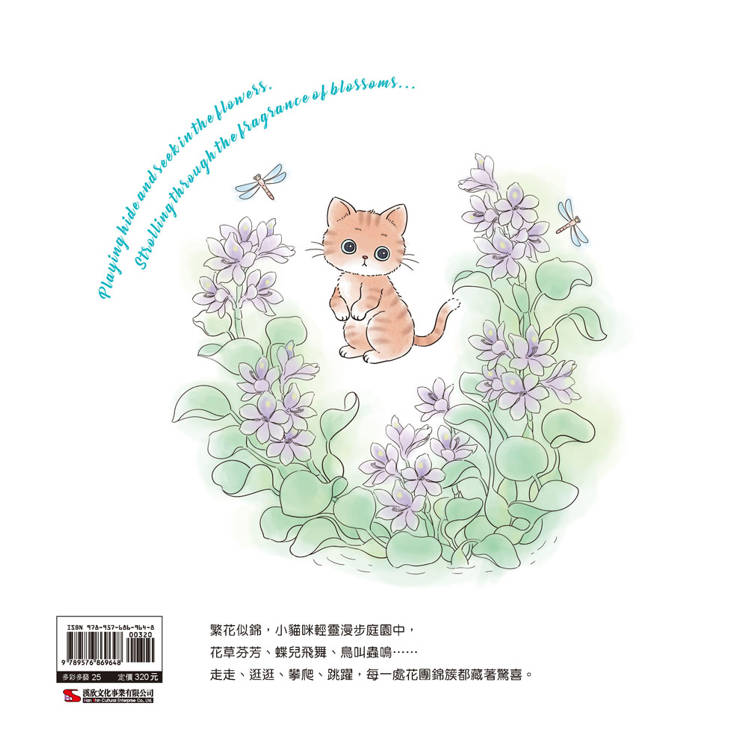 好奇地鑽出繡球花叢、走過綴滿繁花的拱門,小貓咪立刻被玫瑰花包圍了!咦?那是蟋蟀嗎?還有蝴蝶也來陪我玩了呀!
