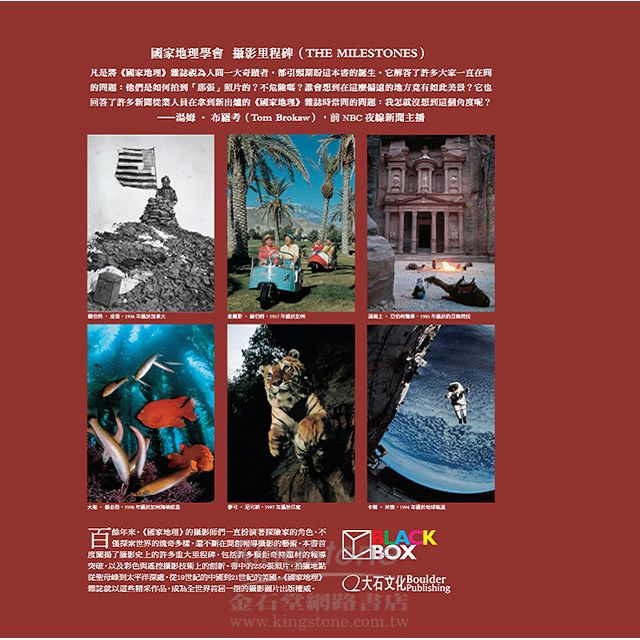 也許從解構的角度分析早期《國家地理》作品背後的時代思維、或勾勒出《國家地理》攝影及報導風格改變的軌跡,以及《國家地理》如何創立獨樹一格的影像風格;作者們更針對不同時期的攝影里程碑中,挑選經典代表的作品,另闢新的篇章,藉由這些堪稱經典的作品--許多甚至不曾被刊載過--為讀者詳細闡明每個創舉在攝影史上扮演的重要角色:從1910 年《國家地理》雜誌首度刊出的彩色照片,到1927 年首度刊出的水下彩色照片,乃至今日最先進的攝影技術及其所引發的議題等。