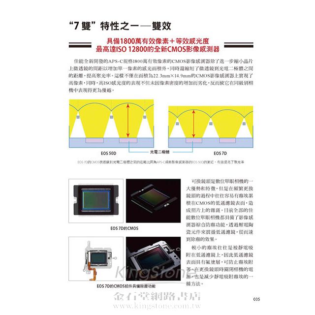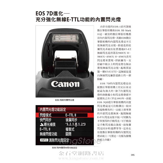 ◎EOS數位機型的進化史◎全面進化的佳能數位單眼相機◎“7雙”特性◎充分強化無線E-TTL功能的內置閃光燈◎EOS 7D創新的功能選單◎EOS 7D每秒8張的高速連拍性能◎EOS 7D的外觀變化
