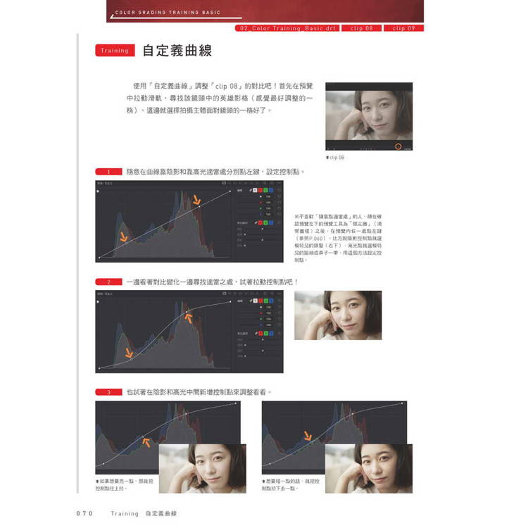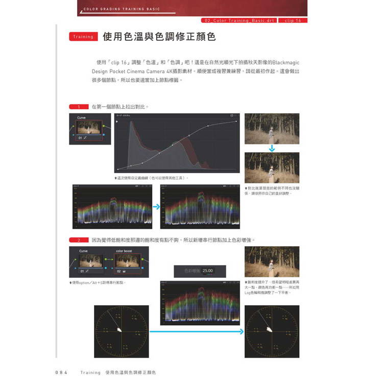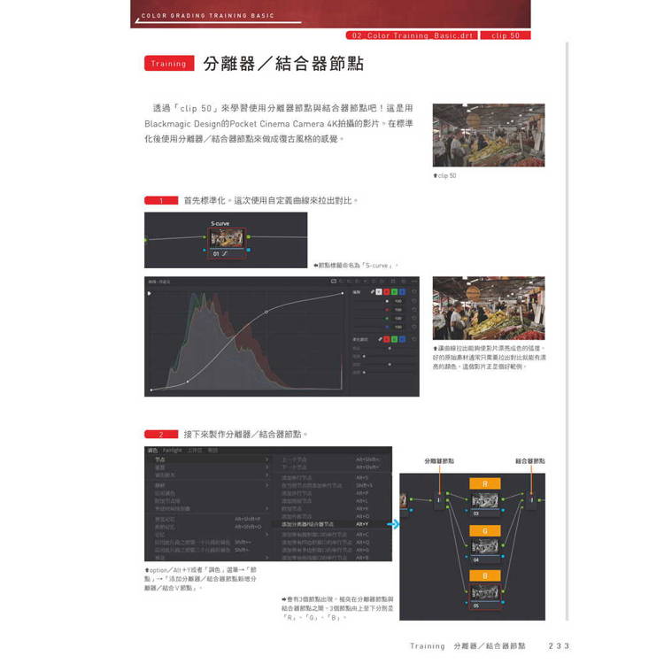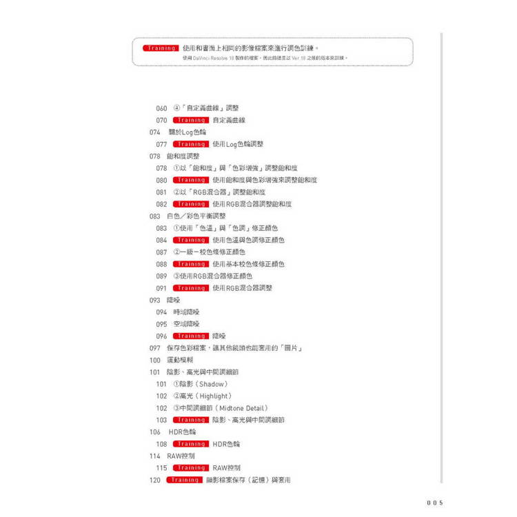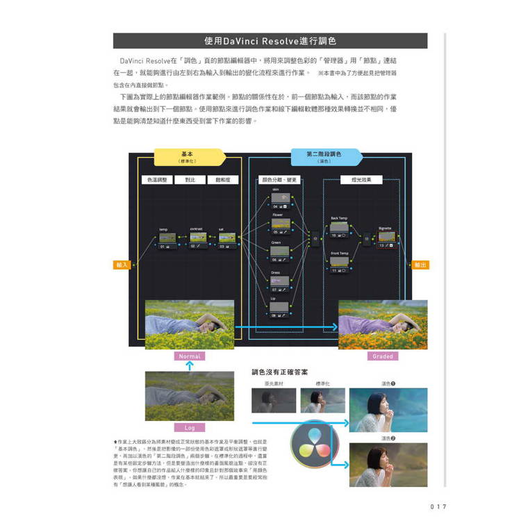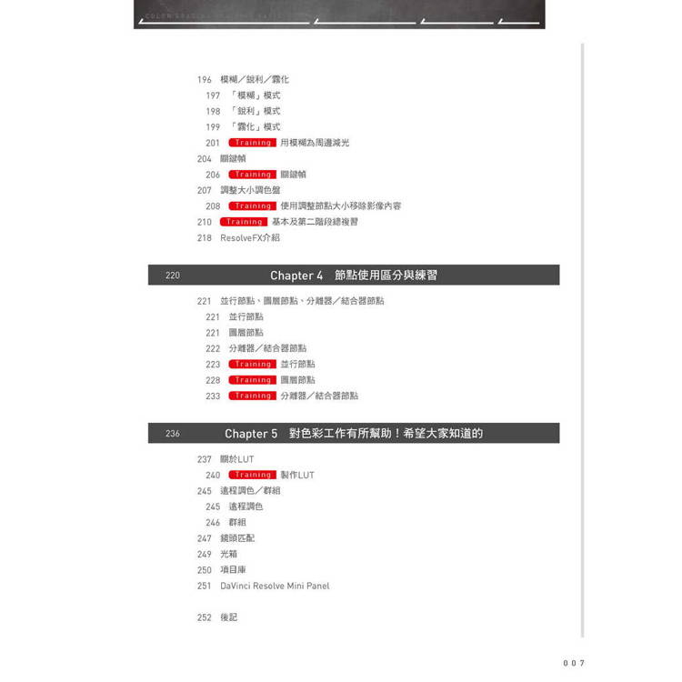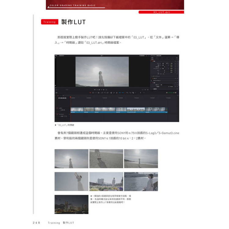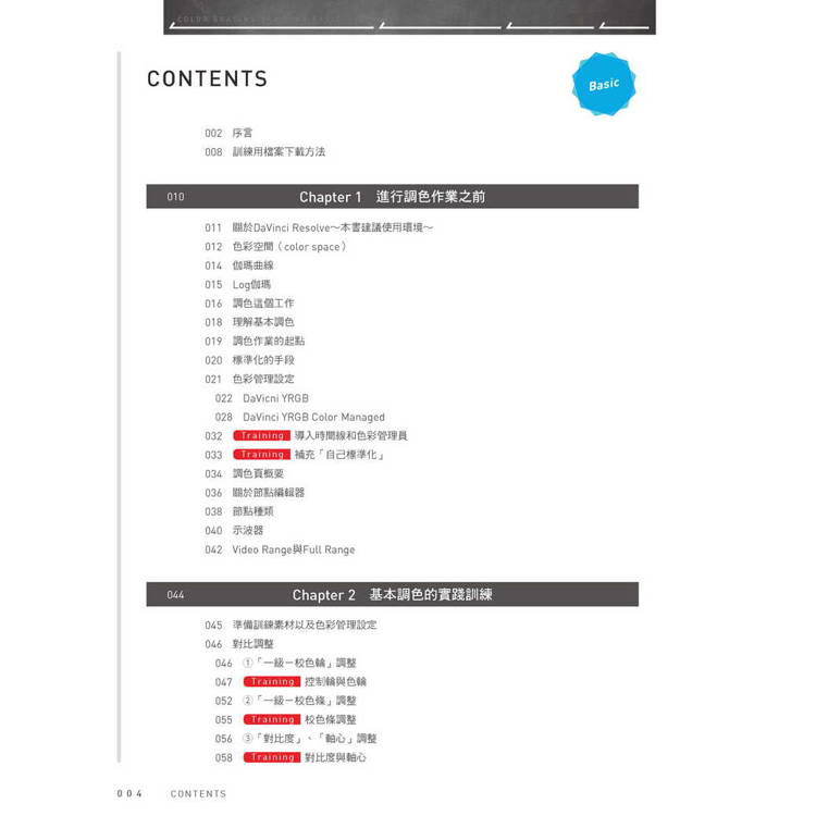 調色工作雖然非常有趣,但是在能夠享受樂趣之前有許多必須記下的事情。本書命名為《color grading training Basic 調色訓練基礎》,是以DaVinci Resolve的調色頁上實際使用的工具,使用實際上的攝影素材來實踐的練習內容。在訓練結束以後,肯定能夠擴展您自己製作的影像表現幅度、思考方式及深度。