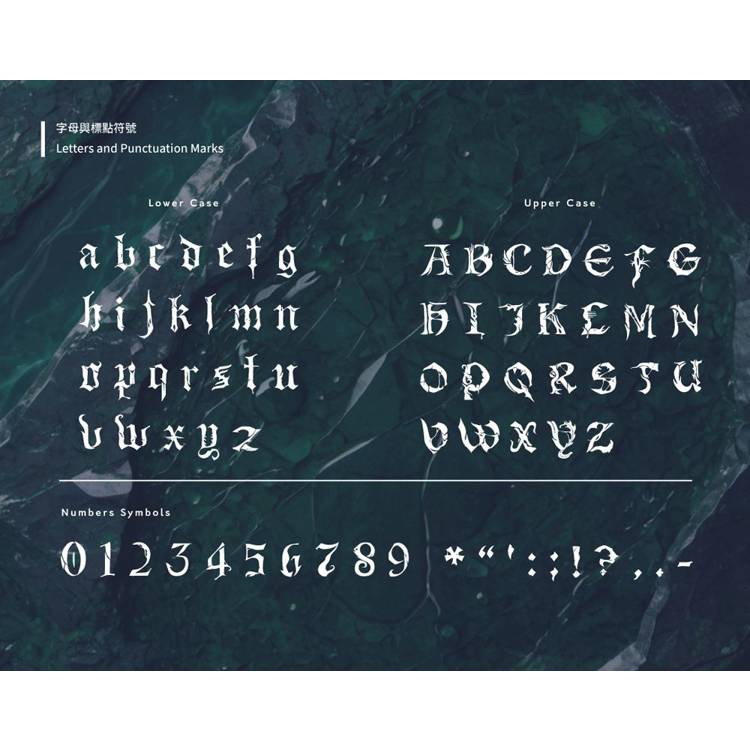 全套字體包含 26 個英文字母大小寫、10 個阿拉伯數字、10 個常見標點符號,
