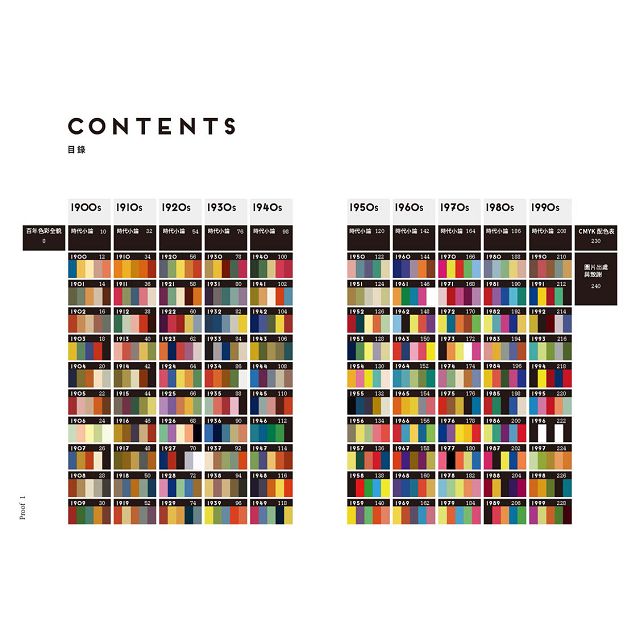 本書為二十世紀的每一年選擇一張代表圖像,並挑選五種顏色,運用不同比例來調色。文中會標示出sRGB(標準紅綠藍)值,供讀者參考與複製。此外,本書以十年為一個期間,每期間都附上導讀,提供當時流行色彩的背景資訊,並描述文化與藝術界發生了哪些大事。本書選擇的圖片主題非常豐富,有時尚、室內設計、音樂和電影,來源也很多樣,包括海報、雜誌、廣告、壁紙與紡織品等各種大量生產的圖像之作。