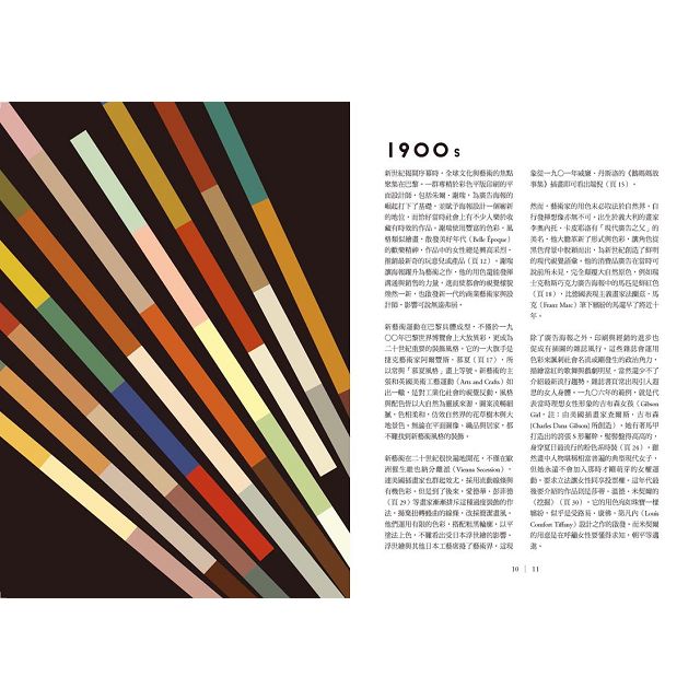 本書精挑細選許多圖片,在頌揚色彩的力量之際,也是一趟二十世紀的視覺之旅。首先登場的是新藝術(Art Nouveau)的自然色調,接下來還有二次世界大戰期間盛行的「愛國風」用色;一九六○年代出現繽紛的七彩色調,而霓虹燈似的色彩更是龐克族用來展現身分認同的方式。色彩能夠將變動、觀念與感受化為具體視覺,有些色彩甚至成為一個年代或某種思潮的代名詞。正如社會在穩定與動盪之間交替,色彩也會輪替變化,有時透過和諧的色調來表達安定,有時則透過衝突的組合來傳達激動。在二十世紀的一百年期間,科技革新了我們創造與複製圖像和物體的手法,也改變我們生 活中的色彩感受。
