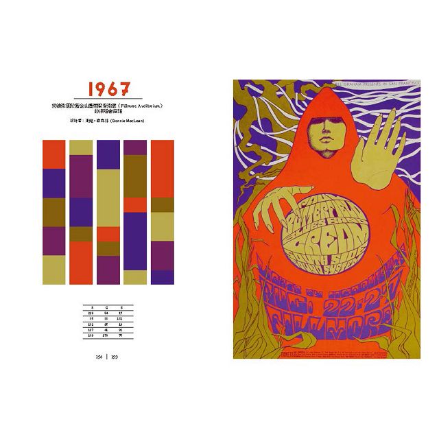 人類的領域不再受限於地平線,共產與資本主義的意識形態之爭引爆了蘇聯與美國的太空競賽,雙方都想在外太空稱霸,六○年代初期還出現過鼓勵蘇聯「征服宇宙!」的海報(頁144)。雖然蘇聯太空人尤里・加加林(Yuri Gagarin)在一九六一年率先搭乘太空船繞行地球,但美國在一九六九年登陸月球,成為太空爭霸的最終贏家。設計師由此獲得靈感,採用金屬色澤與宇宙風;不過,六○年代異想天開之舉可不只如此。一九六七年,迷幻風潮席捲全球,成千上萬「花派嬉皮」(flower children)湧入舊金山,這群反文化的嬉皮把舊金山視為聖地,大肆享受性愛、藥物與搖滾樂,此後那段期間就稱為愛之夏。藝術家與設計師頻繁採用萬花筒般的色彩與波狀的圖案 ,看上去宛如吸毒後的幻覺。新藝術的流動線條也與迷幻風潮一拍即合。畫家波妮・麥克林幫知名的費爾摩音樂廳繪製過許多文宣,包括英國「奶油」搖滾樂團的海報,風格神祕,色彩飽和生動,流線有機的圖案正是她對迷幻風的詮釋(頁159)。裝飾藝術也在六○年代末捲土重來,一九六八年米爾頓・葛雷瑟為美國歌手艾瑞莎・弗蘭克林製作的海報就是一例。這張海報出現在短命的《Eye雜誌》的插頁,葛雷瑟把六○年代流行的深紫、中藍與焦橙色,用在機械時代的幾何形狀與文字編排上(頁160)。當時美國民權運動人士經常傳唱弗蘭克林的歌曲,以及摩城與史塔克斯唱片公司的黑人歌手作品。這群非裔美國人抗議種族隔離與不平等,主張他們的黑色皮膚正正當當,且代表美麗、有力量。