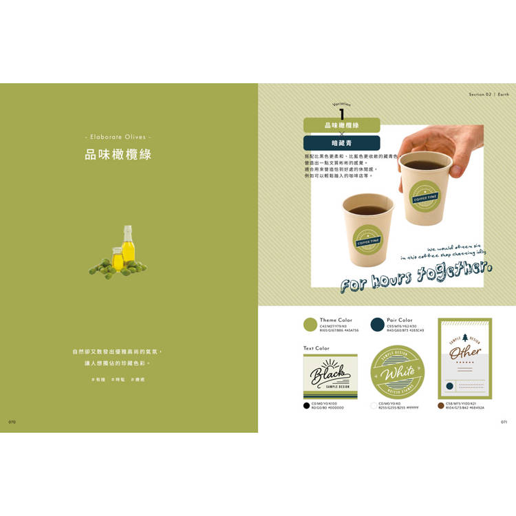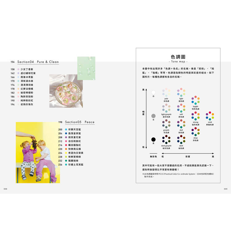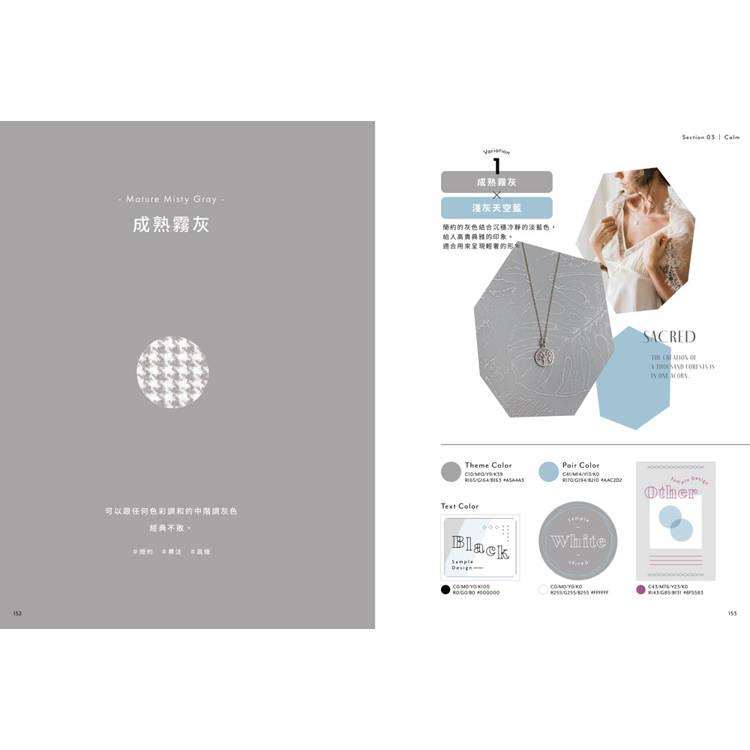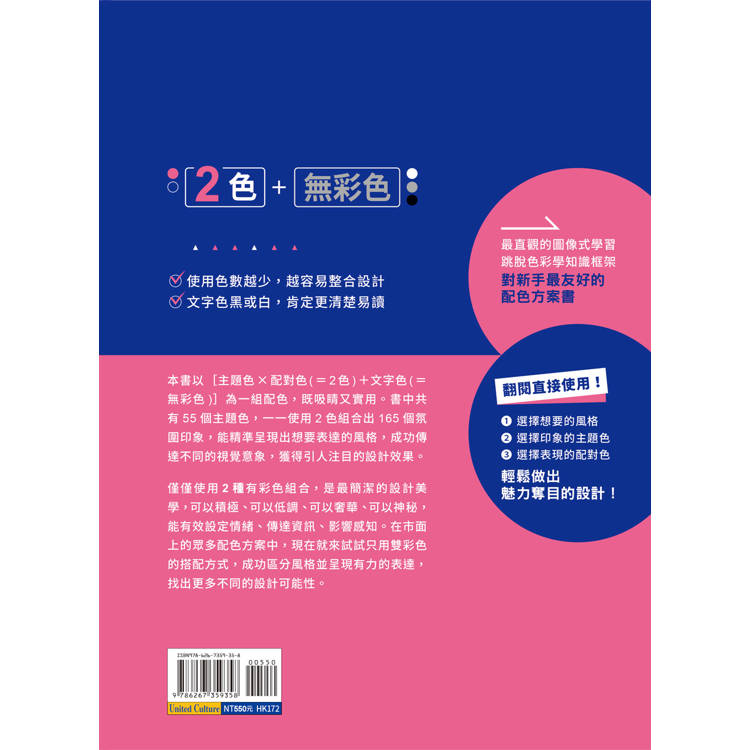 本書以[主題色×配對色(=2色)+文字色(=無彩色)]為一組配色,既吸睛又實用。書中共有55個主題色,一一使用2色組合出165個氛圍印象,能精準呈現出想要表達的風格,成功傳達不同的視覺意象,獲得引人注目的設計效果。
