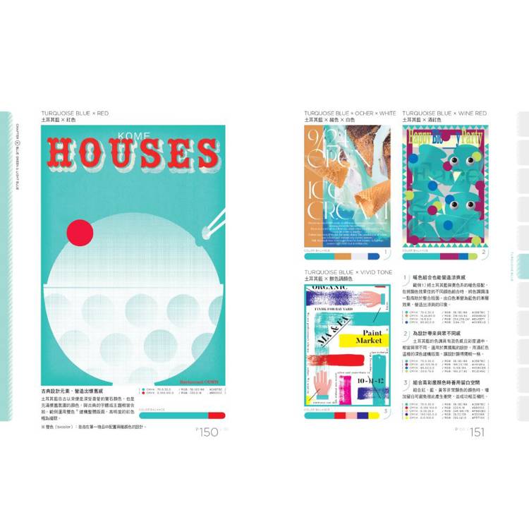 土耳其藍自古以來便是深受喜愛的寶石顏色,也是充滿懷舊氛圍的顏色,與古典的字體或主題相當合拍。範例運用雙色建構整體版面,高明度的紅色極為搶眼。