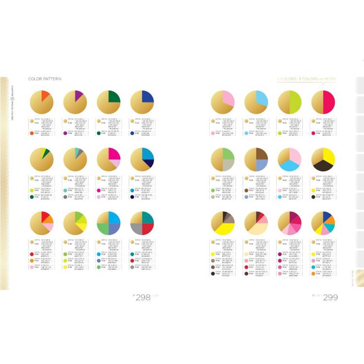收錄11大主題色系範例,提供CMYK和RGB色號及配色占比條狀圖,隨查隨用。