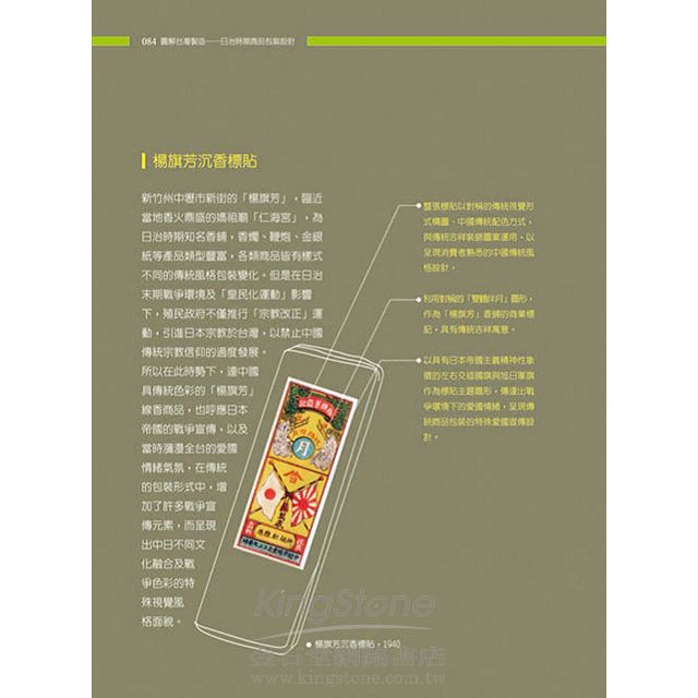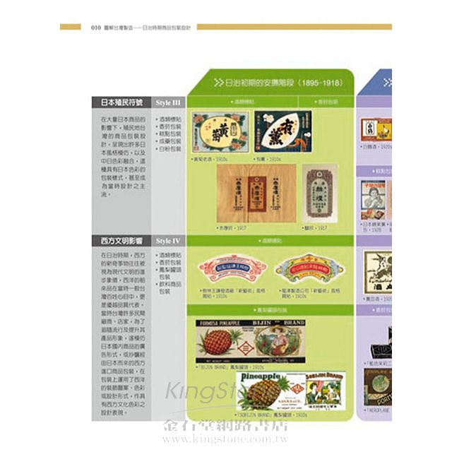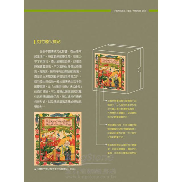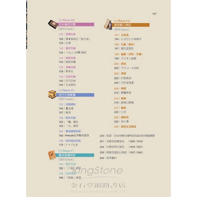 因此,本書將以日治時期台灣常民生活中的商品包裝為書寫對象,從藝術社會學觀點分析殖民地台灣社會環境變化,對於當時商品包裝設計發展所造成的影響,而歸納此特殊階段台灣包裝設計之視覺風格類型與表現形式特色。期能透過這些歷史圖像資料的整理分析,使塵封百年的台灣早期商品包裝設計,有較清楚完整的面貌呈現,以及從商品消費文化角度,窺見先民生活的豐富內容變化,並為台灣生活文化與視覺設計研究建立多元史料基礎,而有助於讀者對此時期台灣常民生活美學與視覺流行品味的認識與瞭解。但由於日治至今歷經長遠的時代更迭與環境變化,許多早期包裝資料已無法全面蒐集,因此本書僅能藉由部分代表性包裝圖像的分析,以窺探當時台灣商品包裝的視覺文化現象,而作初步的資料整理與書寫,其中仍有許多未臻完整之處,尚祈各界指正。