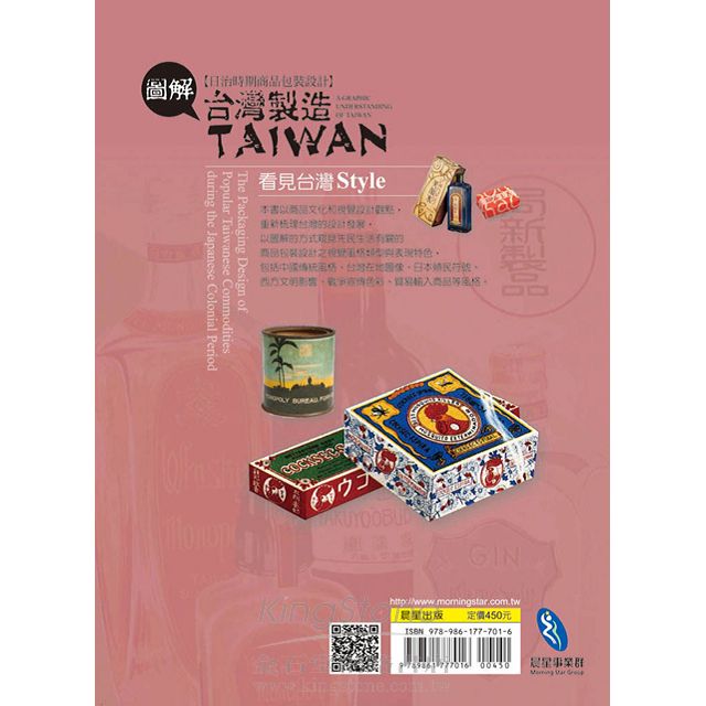 本書以商品文化和視覺設計觀點,重新梳理台灣的設計發展,以圖解的方式窺視先民生活有關的商品包裝設計之視覺風格類型與表現特色,包括中國傳統風格、台灣在地圖像、日本殖民符號、西方文明影響、戰爭宣傳色彩、貿易輸入商品等風格。
