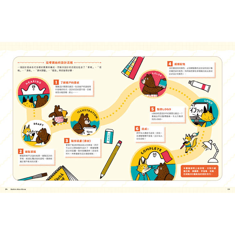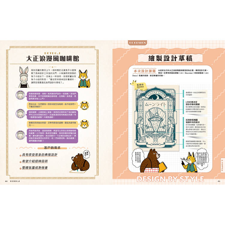 書本內容主角為狐狸與小熊,是一對住在森林裡的師徒。狐狸開了一間個人工作室,小熊為了向他取經,在那裡當設計學徒,透過師父帶徒弟的方式,以模擬接案的形式,看他們接待來自各地的客人。客人們會根據自身的行業,提出風格迥異的要求,再看他們如何從發想到完成,一步步拆解、製作出完整的設計!