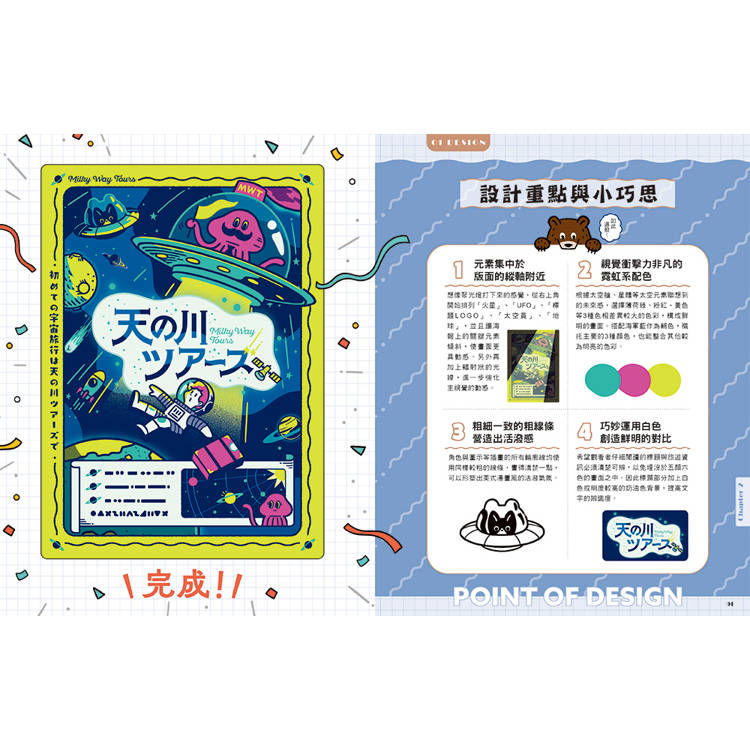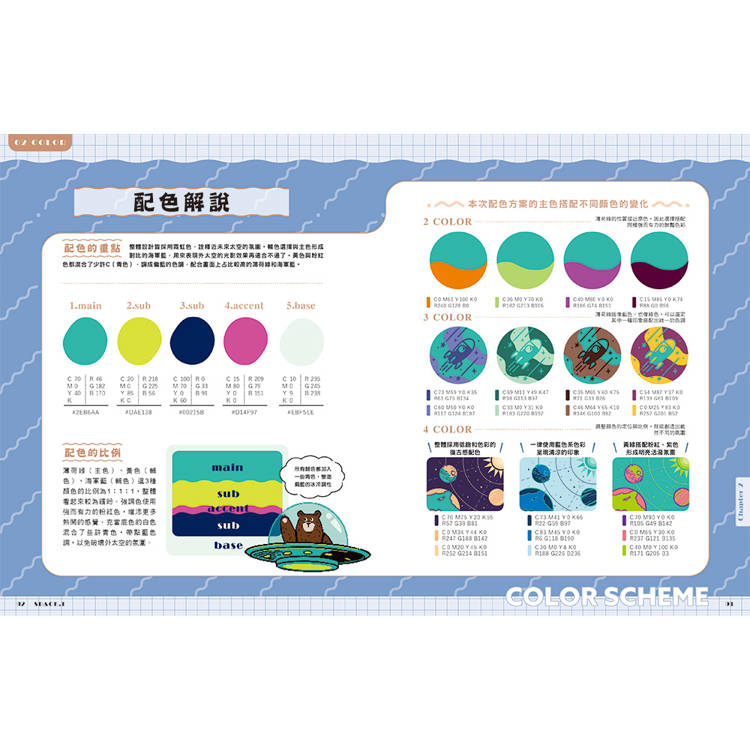 聽到宇宙風設計,你腦中浮現出了什麼樣的圖案?是星斗無數的夜空,還是幽暗太空船艙裡頭閃爍的藍綠色按鈕?又或者是冰冷粗獷的金屬和管線爬過灰色牆面的黑暗世界?不同世代、接觸過不同科幻作品的人,對於宇宙的印象想必也不盡相同。也因為這樣,宇宙風設計和復古風設計相比,並沒有什麼一看就知道的標誌性元素與形狀,設計起來更加困難。而這種時候,先處理配色會比較容易上軌道。本章會介紹2樣宇宙風設計的範例,帶大家學習如何利用配色營造出宇宙的氛圍。