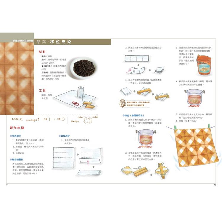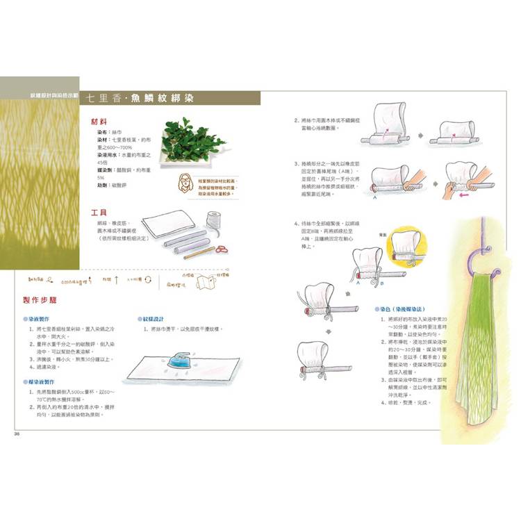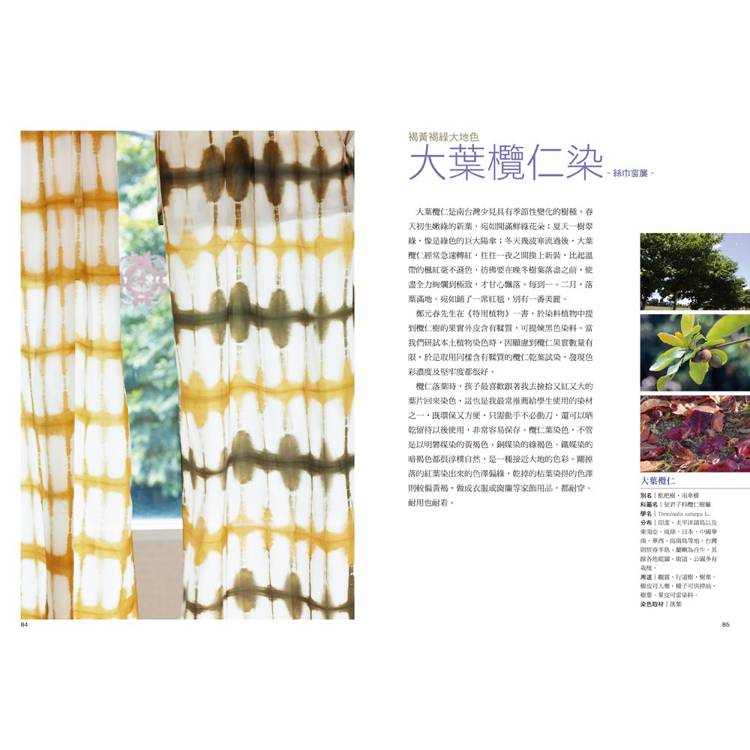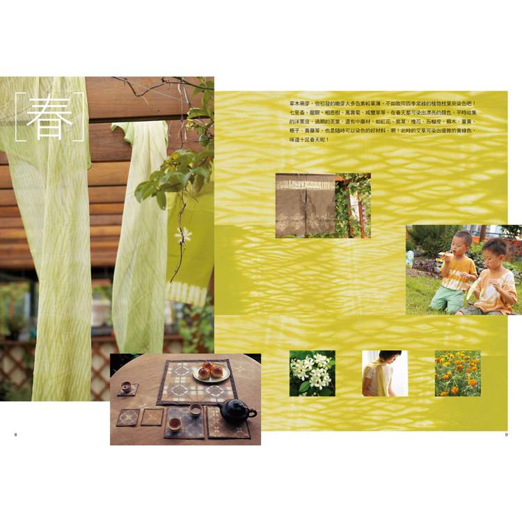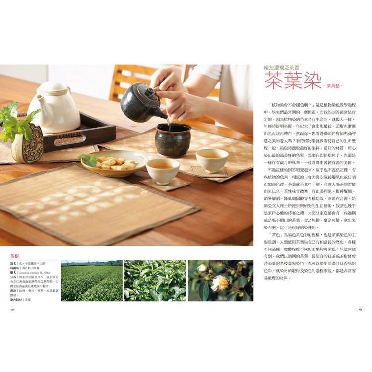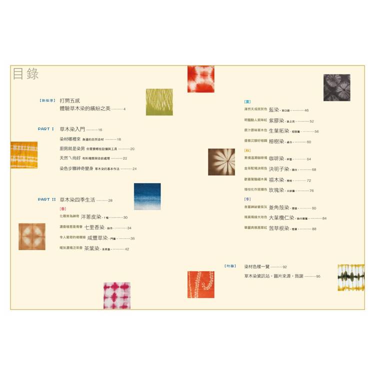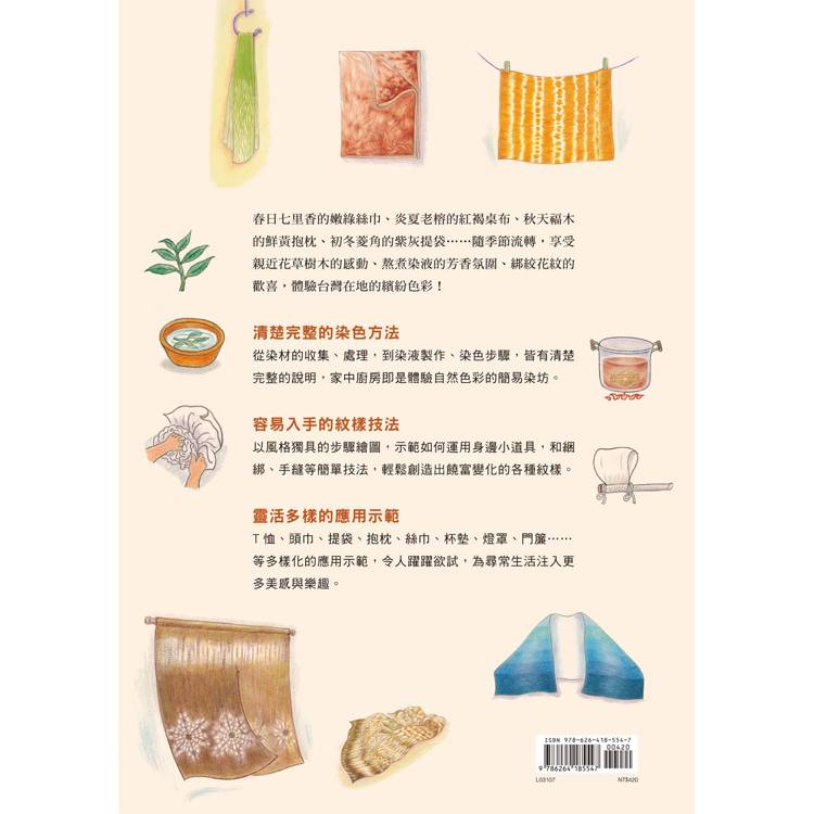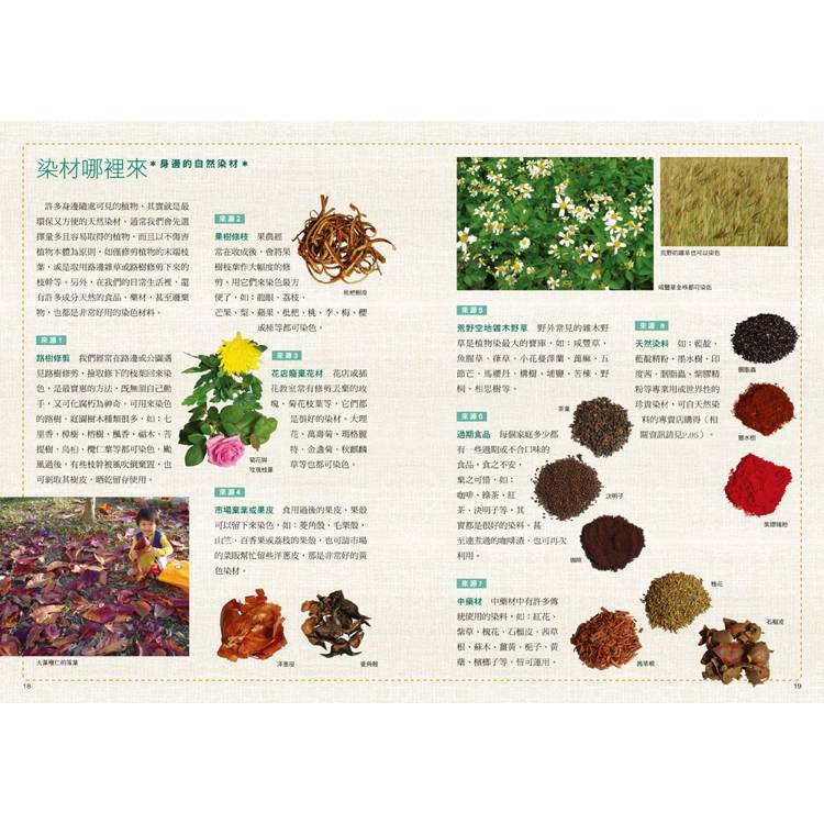 ★清楚完整的染色方法:按季節區分,無論是春季的洋蔥皮、七里香、咸豐草、茶葉,夏季的藍染、紫膠染、生葉拓染、榕樹,或是秋季的咖啡、決明子、福木、玫瑰,冬季的菱角殼、大葉欖仁、茜草根……,從各種天然染材的收集、處理,到染液製作、染色步驟,皆有清楚完整的說明,家中廚房即是體驗自然色彩的簡易染坊。