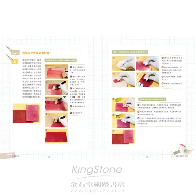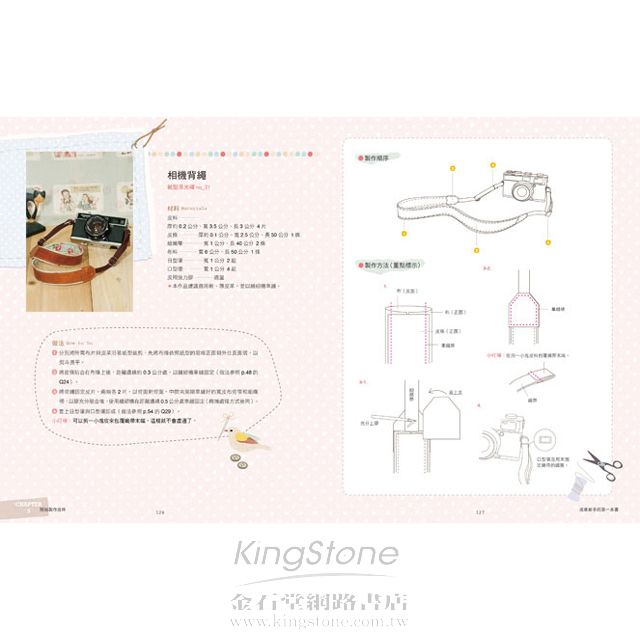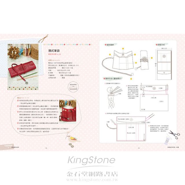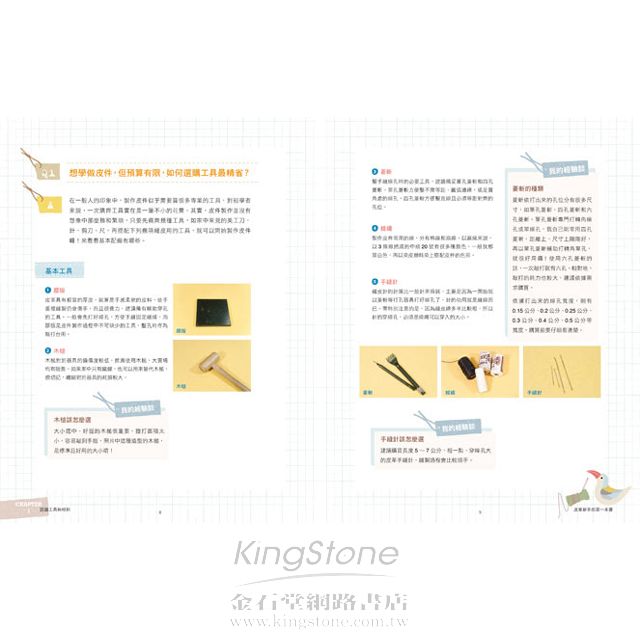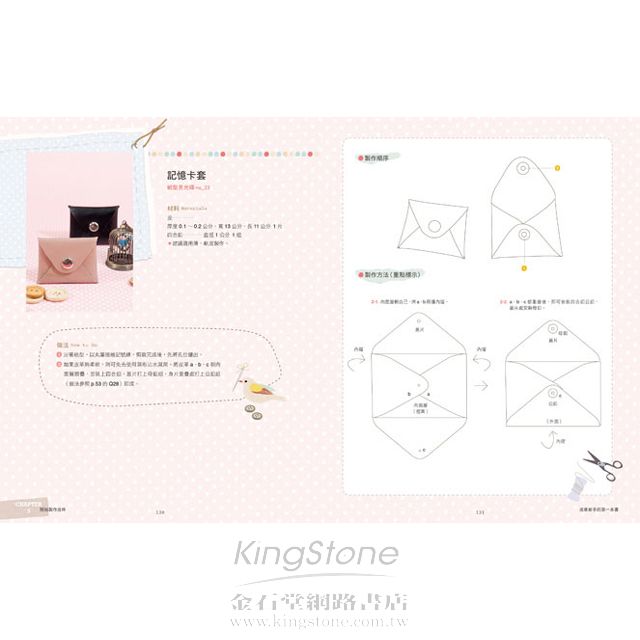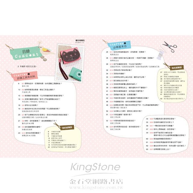 本書專為新手所設計,分為:〈CHAPTER 1認識工具和材料〉、〈CHAPTER 2必學基本功〉、〈CHAPTER 3開始製作皮件〉三個章節,內容循序漸進,即使沒有接觸過皮件製作,也一點都不需要擔心。每件作品都附有紙型,跟著剪裁、縫合,大幅提高製作成功率。