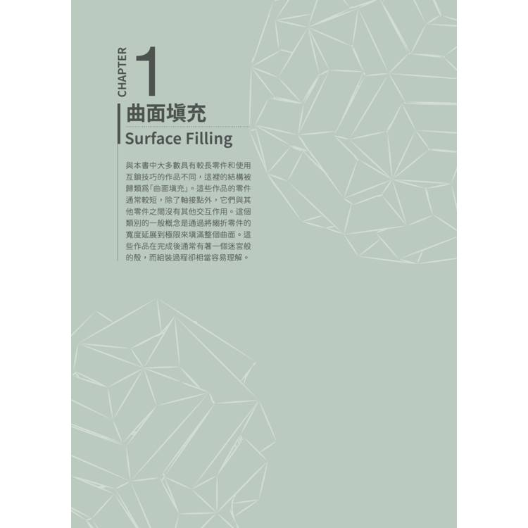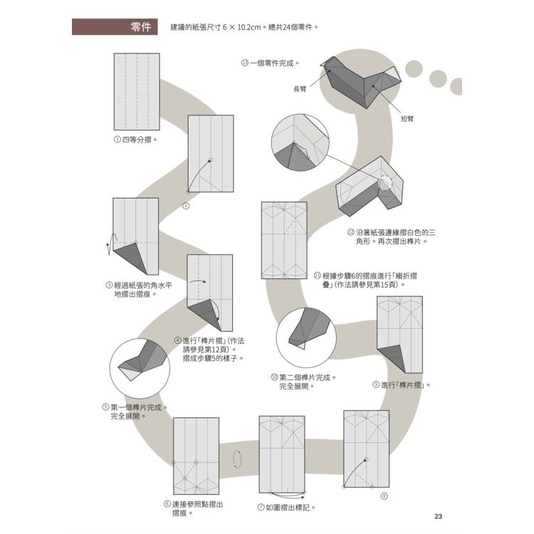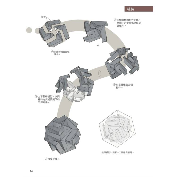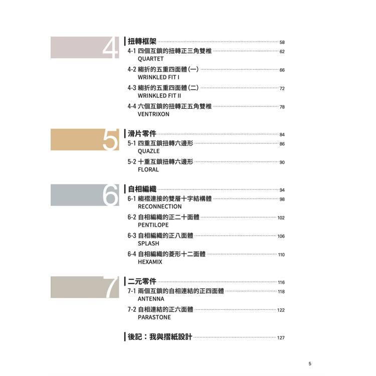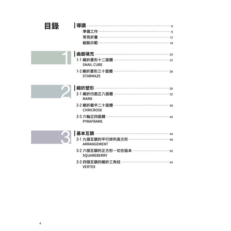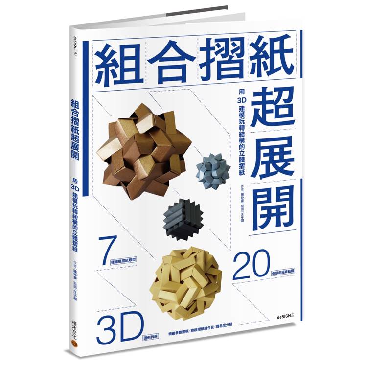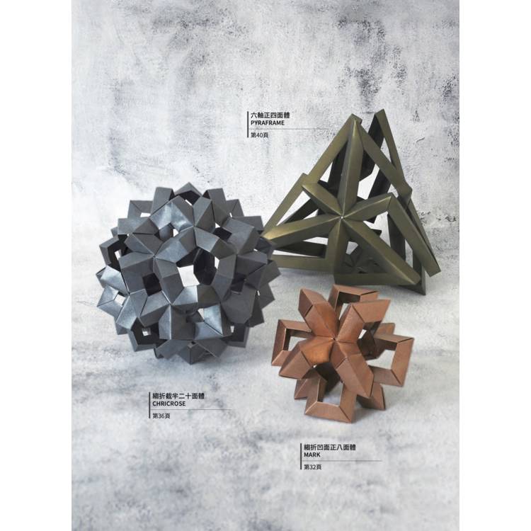 組 合摺紙是一種摺紙技巧,也可以視為一門結合幾何、數學和創意的藝術形式。本書主要以「線框型組合摺紙」(Wireframe)為題,結合電腦建模的精密計 算,經過反覆篩選而誕生的20款經典造型,呈現出獨一無二的精湛摺紙工藝;並且將常用摺法公式化、搭配詳盡的拆解圖例,一步步帶領你在摺紙藝術中探索幾何 的無限可能!