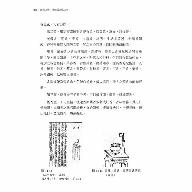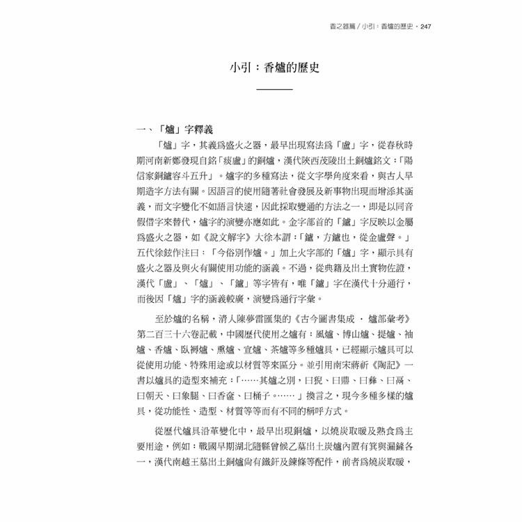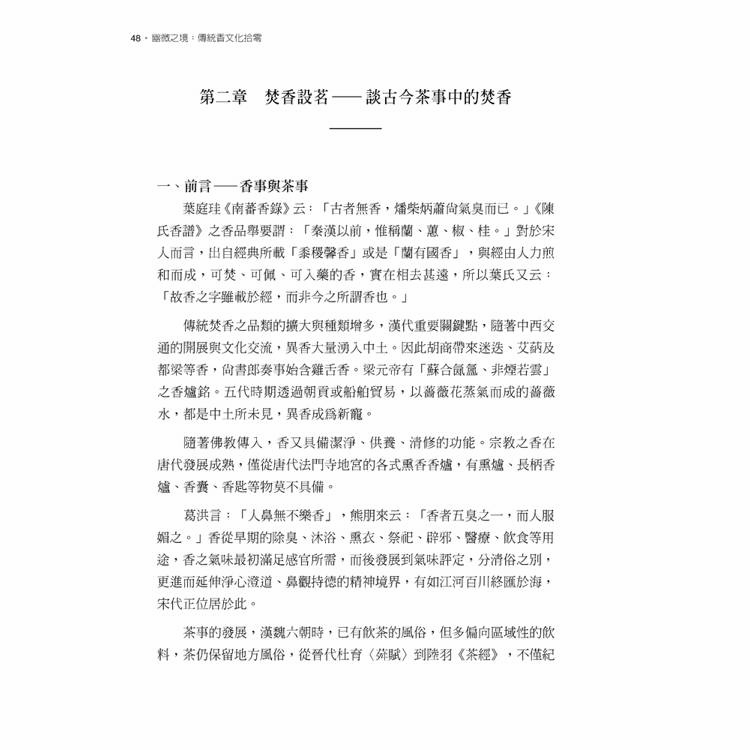 本書分成:〈香之史〉、〈香之譜〉、〈香之器〉、〈香之法〉四篇,從用香的歷史源流,概覽歷朝歷代的用香小史、文人用香、茶席品茗中的用香等等,以及文學名著《紅樓夢》中鐘鳴鼎食之家的用香風氣與品味。其次,〈香之譜〉一覧宋元時期各家《香譜》,是古人用香的百科全書,𢑥集用香歷史、典故、軼聞、詩文,與香材的產地、特徵、修治方法,以及香方、調配製作等主題,閱讀《香譜》是通往香文化的一條最為便捷的道路。〈香之器〉談漢魏晉時期博山爐、唐宋時期香爐造型演變,以及宋之後盛行爐瓶盒等用香器具。最後〈香之法〉,動手實踐這些古人流傳下來的香方,建立屬於現代香席的品香文化,也是貼近心靈、頤養身心的好方法。