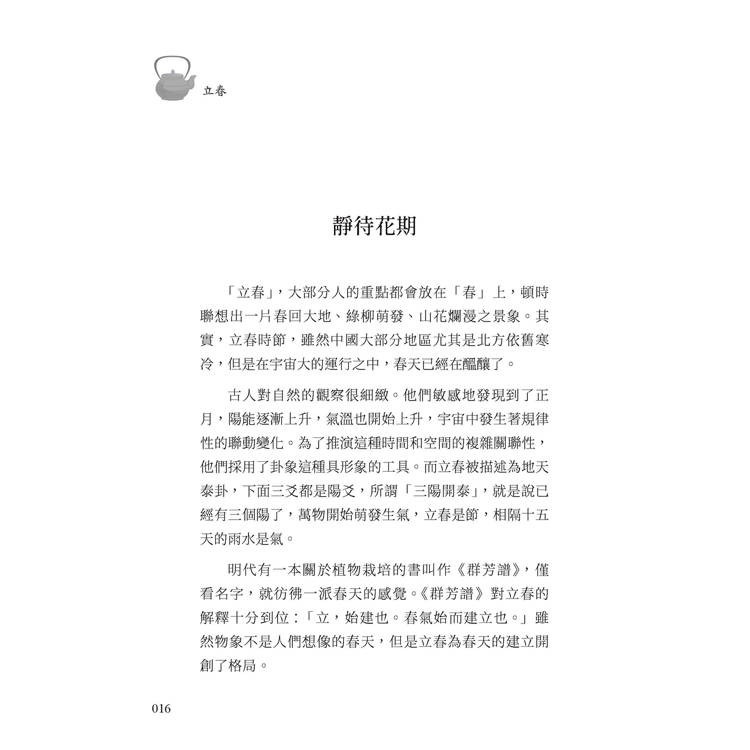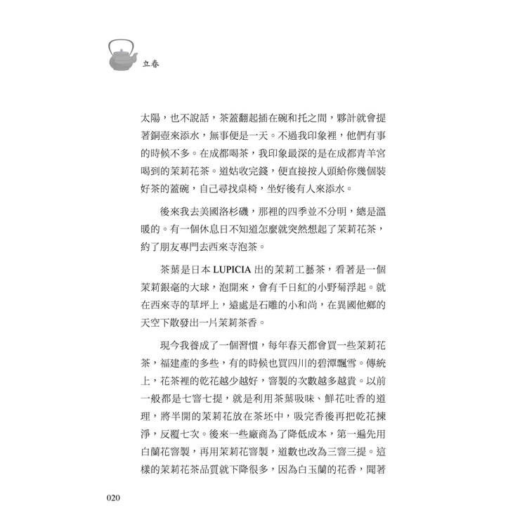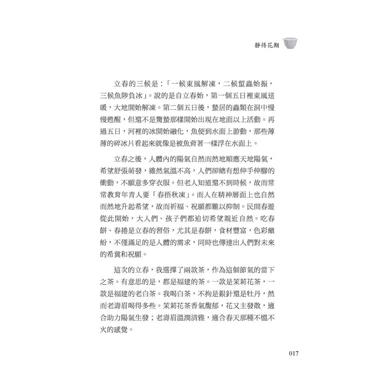 從立春到大寒,二十四節氣構成完整的一年,也映照人生的節律。本書最動人的地方,不在於介紹多少名茶,而在於透過茶讓人重新看見時間的質地。當季節流轉,茶香也在變化,而人的心境亦隨之沉澱。讀完這本書,或許會發現:真正值得珍惜的,並非稀有名茶,而是能在光陰裡安靜坐下,為自己泡一杯茶的那一刻。
