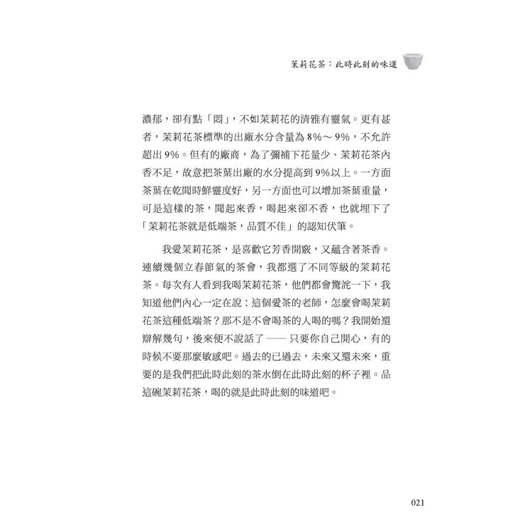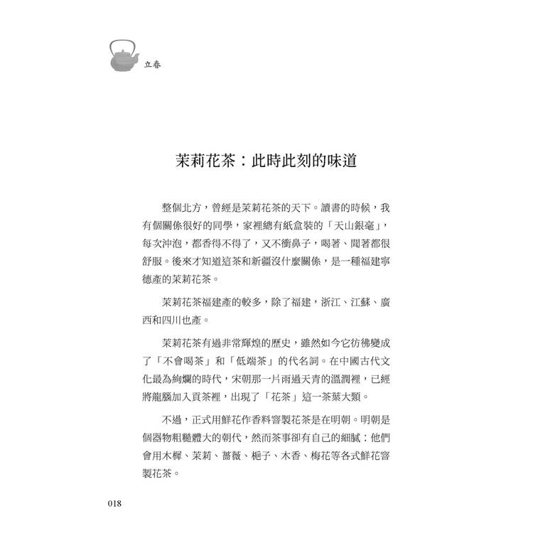 一年有四時更迭,茶也有自己的節律。本書以二十四節氣為軸,將自然時序與茶的香氣交織成一條流動的時間之線。立春的花意、春分的和暖、夏至的盛陽、秋分的澄明、冬至的靜寂,每一個節氣都像一個停駐的驛站,等待人們以一盞茶重新體會天地的節拍。茶在書中不僅是飲品,更像一種感知時間的方式——當茶香升起,人也得以在繁忙生活裡重新與季節相遇。