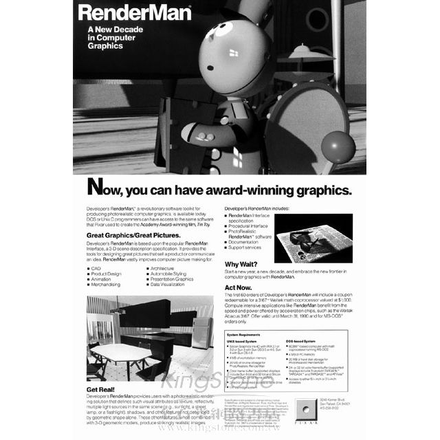 1987年,在設計新電腦同時,負責皮克斯影像電腦軟體的工程師,生物物理學博士派特.漢拉漢(Pat Hanrahan)相信,皮克斯真正有價值的資產,應該是演算繪圖程式「雷耶斯」(Reyes)。這套軟體已經出到第4版,在製作《安德烈與威利》以及《頑皮跳跳燈》時證明了自己的能力。他開始四處找尋讓Reyes成為產品的機會……。