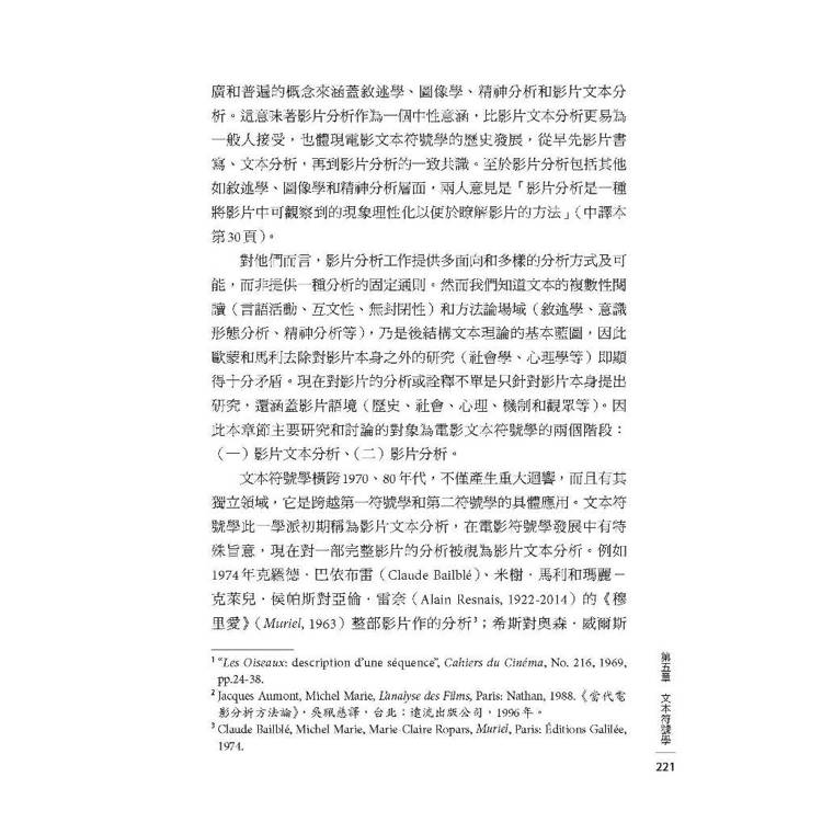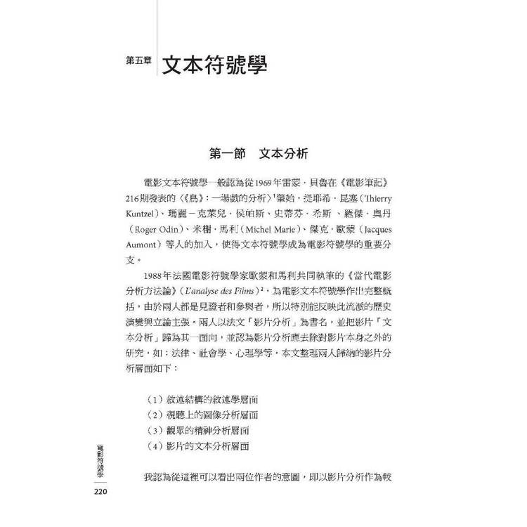 第四章即以電影符號學理論為主要內容,分別討論梅茲的第一符號學和第二符號學,希望通過解釋、行動能帶來他不同時期的核心架構和意涵。在寫梅茲這章時,個人感受最為複雜,大師容貌在腦海裡仍不時浮現。在1970年代後期負笈巴黎學習電影,巴黎第三大學即以電影符號學為學術發展重鎮,聚集有米榭.馬利、傑克.歐蒙、米榭.高藍、塞吉.丹內、法蘭索瓦.若斯特、馬克.偉內、亞倫.貝哥拉等人,當然最後還有梅茲每星期一次的著名講座。在他的講座上永遠擠滿世界各地來的學者和學生,他上課條理分明,不僅散發著學術研究的嚴肅性和深刻性,還散發著某種知識探究的溫暖,就算在遠處都可以感受到,這也是長期激勵我在學術或教學上追求的主要目標之一。