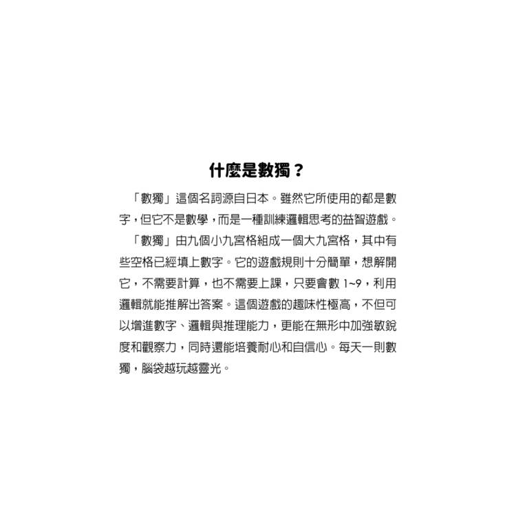不怕年紀大,只怕腦袋不動它!《數獨》系列特別為家中樂齡長者設計,內含90題手工原創的基礎數獨題,讓入門玩家能夠隨手翻閱、隨時解題。玩家每解完一道題目就會隨機獲得星星、獎牌、獎盃等獎勵,每天看見自己的進步,越玩越上手!玩家可以依照自己的喜好,挑選喜歡的主色,挑戰精選的90道數獨題;也可以一次收藏系列三本,一本本解完所有題目,化身終極數獨達人。