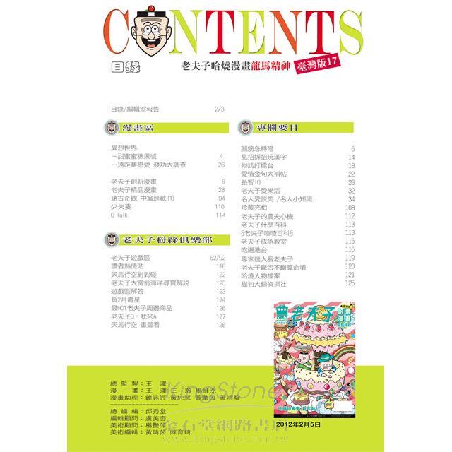 內容包羅萬象,由老夫子領軍各漫畫人物進行多項互動頁面的撰寫,豐富讀者的視覺與知識,相關主題包含