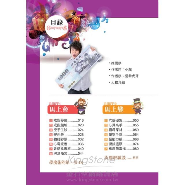三、將魔術分為五大類:「馬上會」的簡易魔術、可利用隨身小物的「馬上變」魔術、自己動手做的「道具DIY」神奇魔術、千變萬化的「撲克牌」魔術、可以讓你「上台表演」的互動魔術。