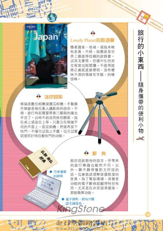 旅行計畫是成行的關鍵之一,良好的規劃才有美好的旅行。本篇除了詳細說明適合旅行攜帶的物品之外,也提供讀者蒐集行前資料的方法。