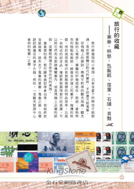 旅行所帶回來的紀念品、票券、錢幣……每一樣都想留下來做紀念,久了之後卻發現全都靜靜的放在角落的袋子裡,?也不是、留著也不是。何不賦予他們新生命,只要一些小技巧,就是一份美好的旅行紀錄。