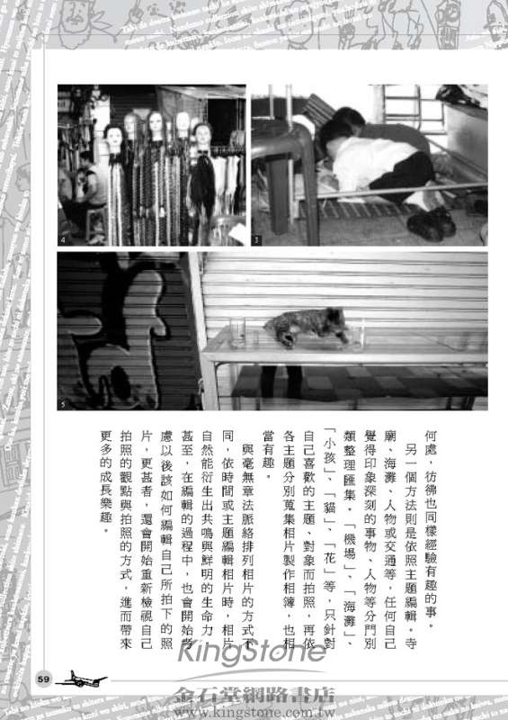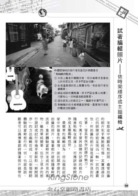 數位相機盛行後,拍照成為無法節制的習慣。大量的照片,總是在旅行結束後占據電腦中的大量空間。花點時間給其中幾張照片新的生命吧!小小的個人攝影展、部落格中的人氣相薄……都是展現自己美好旅程的方式之一,可別忘了,隨筆寫上自己的感想文字,與人分享旅遊心情。