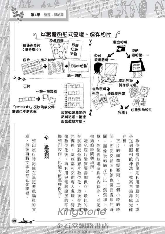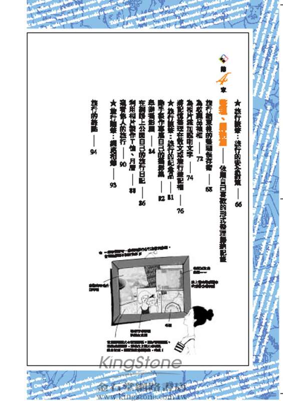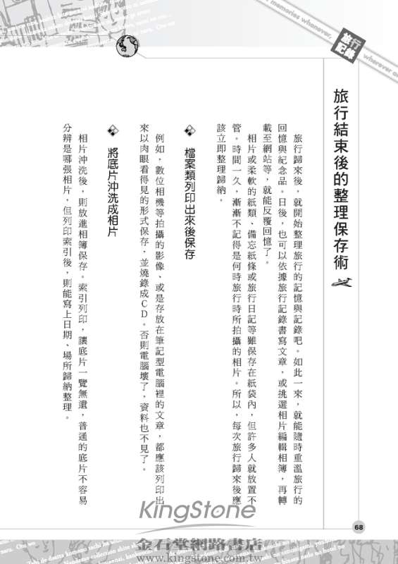 旅行結束後的整理保存術∕為蒐藏品裱框∕為相片添加說明文字∕將記憶整理在散文或旅行遊記裡∕旅行隨筆:旅行的紀念品∕動手製作專屬自己的攝影集∕舉辦攝影展∕在網路上自己的旅行日記∕利用照片製作T恤、月曆∕窺看他人的旅行∕旅行隨筆:網路相簿