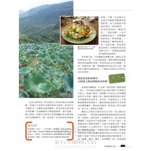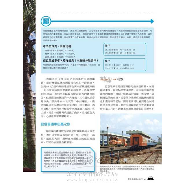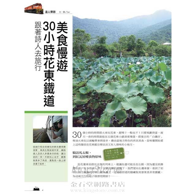 綠色意識抬頭,越來越多人改變旅行方式,透過搭乘大眾運輸、結合單車及散步,完成一趟健康又環保的旅程。鐵路線,是台灣最迷人的旅行線,起至縱貫線北段、山線、海線、縱貫線南段、屏東線、南迴線,往東延伸還有宜蘭線、北迴線及花東線;本書由玩家領路,深入全台鐵路,將主支線沿路獨特的文化及旅遊氛圍呈現出來,發現好吃的、遇見美麗的、體驗精采的。